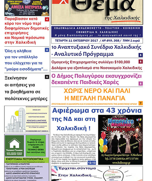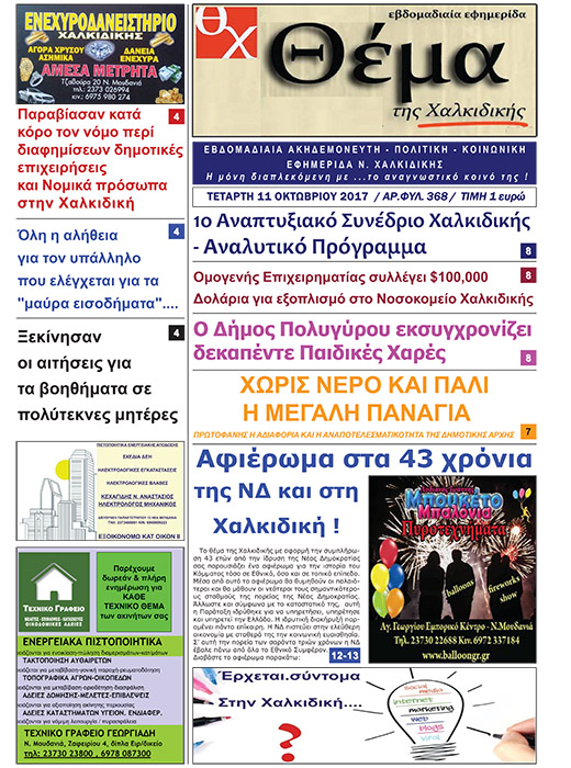 Θέμα Χαλκιδικής Θέμα Χαλκιδικής – Φύλλο 368 Εβδομαδιαία Εφημερίδα “Θέμα Χαλκιδικής” Τετάρτη 11 Οκτωβρίου – Φύλλο 368 Κάντε κλικ στο Πρωτοσέλιδο για να ξεφυλλίσετε. Πλοήγηση άρθρων Προηγούμενο Previous post: Αφιέρωμα στα 43 χρόνια της ΝΔ και στη Χαλκιδική!Επόμενο Next post: Θετικό πρόσημο από τις αστυνομικές δράσεις στη Χαλκιδική το καλοκαίρι ΣΧΕΤΙΚΑ ΑΡΘΡΑ «ΣΥΝΑΝΤΗΣΗ ΑΠ.ΠΑΝΑ ΣΤΗ ΔΟΥ Ν.ΜΟΥΔΑΝΙΩΝ» Εξαρθρώθηκε εγκληματική οργάνωση που διέπραττε κλοπές πολυτελών οχημάτων στη Χαλκιδική « Ο ΑΠ. ΠΑΝΑΣ ΣΤΗ ΒΟΥΛΗ ΓΙΑ ΤΗΝ ΕΝΕΡΓΕΙΑΚΗ ΑΚΡΙΒΕΙΑ» Αφήστε μια απάντηση Ακύρωση απάντησηςΗ ηλ. διεύθυνση σας δεν δημοσιεύεται. Τα υποχρεωτικά πεδία σημειώνονται με *Σχόλιο * Όνομα * Email * Ιστότοπος Αποθήκευσε το όνομά μου, email, και τον ιστότοπο μου σε αυτόν τον πλοηγό για την επόμενη φορά που θα σχολιάσω. Δ Current ye@r * Leave this field empty