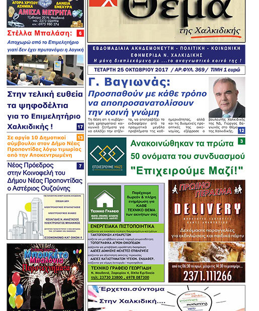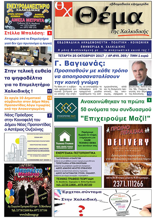 Θέμα Χαλκιδικής Θέμα Χαλκιδικής – Φύλλο 369 Εβδομαδιαία Εφημερίδα “Θέμα Χαλκιδικής” Τετάρτη 18 Οκτωβρίου – Φύλλο 369 Κάντε κλικ στο Πρωτοσέλιδο για να ξεφυλλίσετε. Πλοήγηση άρθρων Προηγούμενο Previous post: Ανακοινώθηκαν τα πρώτα 50 ονόματα του συνδυασμού “Επιχειρούμε Μαζί!”Επόμενο Next post: «Το όνομα σαν όχημα αλυτρωτισμού δεν βοηθάει τα Σκόπια να ενταχθούν στην Ευρωπαική Ένωση» ΣΧΕΤΙΚΑ ΑΡΘΡΑ Δημόσιες υπηρεσίες και Τράπεζες: Έτσι γίνεται η είσοδος των πολιτών Στη… σειρά για την 3η δόση εμβολίου και οι άνω των 50 ετών από την Χαλκιδική Διαβάστε το Θέμα της Χαλκιδικής που κυκλοφορεί Αφήστε μια απάντηση Ακύρωση απάντησηςΗ ηλ. διεύθυνση σας δεν δημοσιεύεται. Τα υποχρεωτικά πεδία σημειώνονται με *Σχόλιο * Όνομα * Email * Ιστότοπος Αποθήκευσε το όνομά μου, email, και τον ιστότοπο μου σε αυτόν τον πλοηγό για την επόμενη φορά που θα σχολιάσω. Δ Current ye@r * Leave this field empty