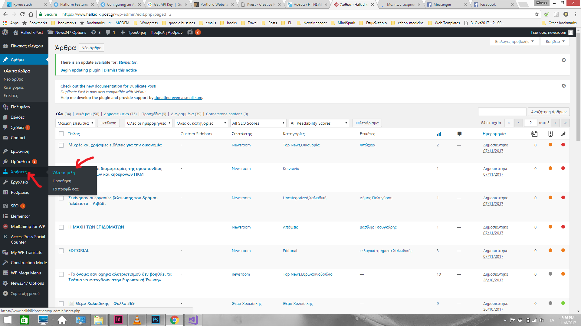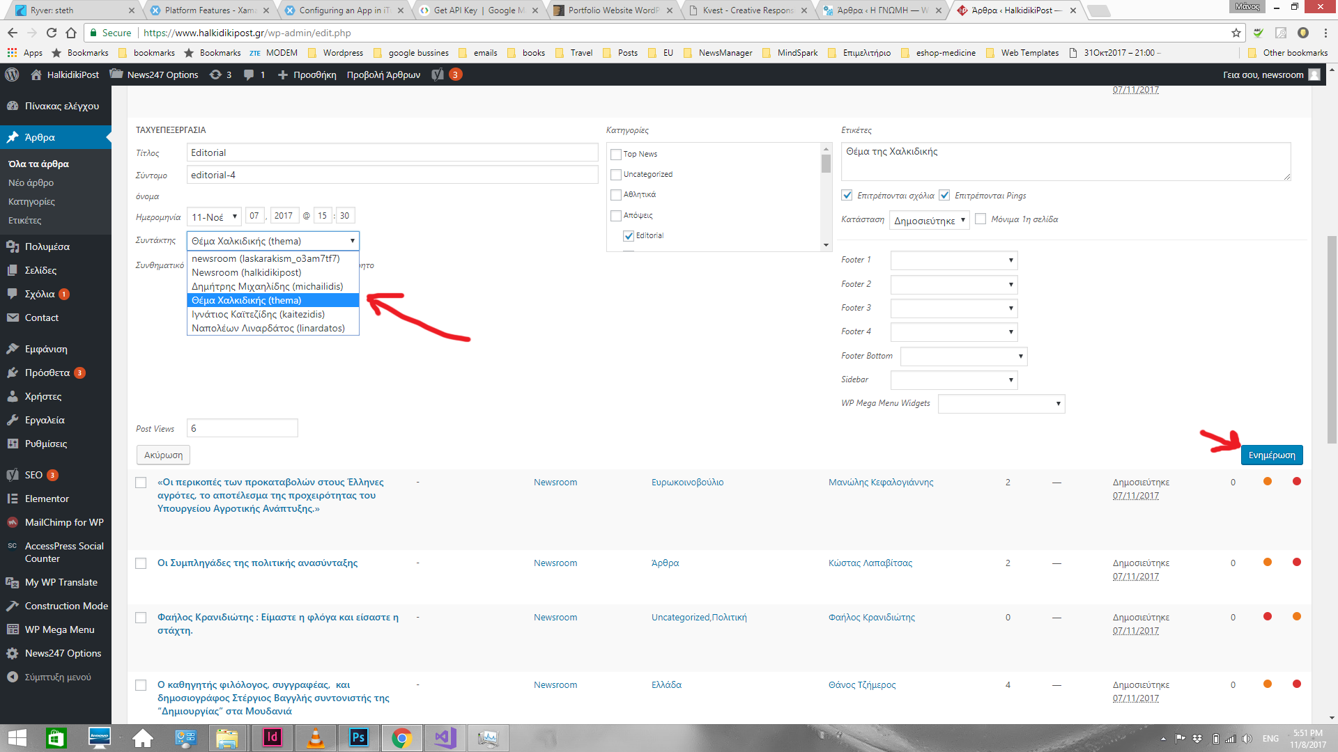 2. Επιλέγεις συντάκτη του άρθρου. Εδώ βάζω στο editorial που δημοσίευσες τον συντάκτη “Θέμα Χαλκιδικής” και πατάω δεξιά κάτω “Ενημέρωση”.