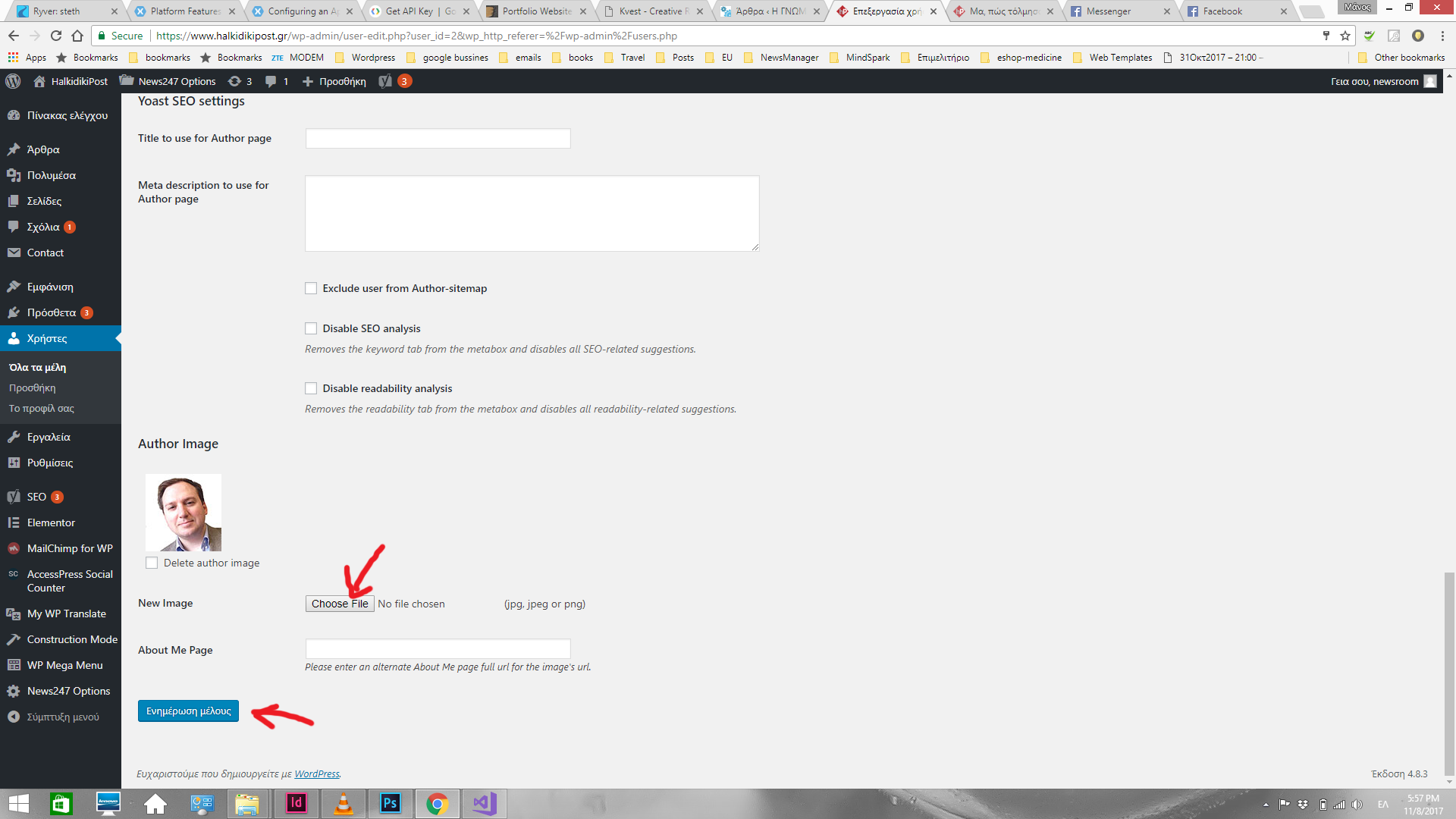 4. Μόλις επιστρέψεις στην λίστα μελών, ξαναεπιλέγεις τον χρήστη (πχ linardatos) και θα δεις ότι σου έχει περισσότερες επιλογες. Εσύ θα πας κάτω και θα προσθέσεις φωτογραφία. Πρόσεξε να είναι μικρή σε μέγεθος , γύρω στα 100-150 pixels. Τέλος πατάς “Ενημέρωση μέλους”.