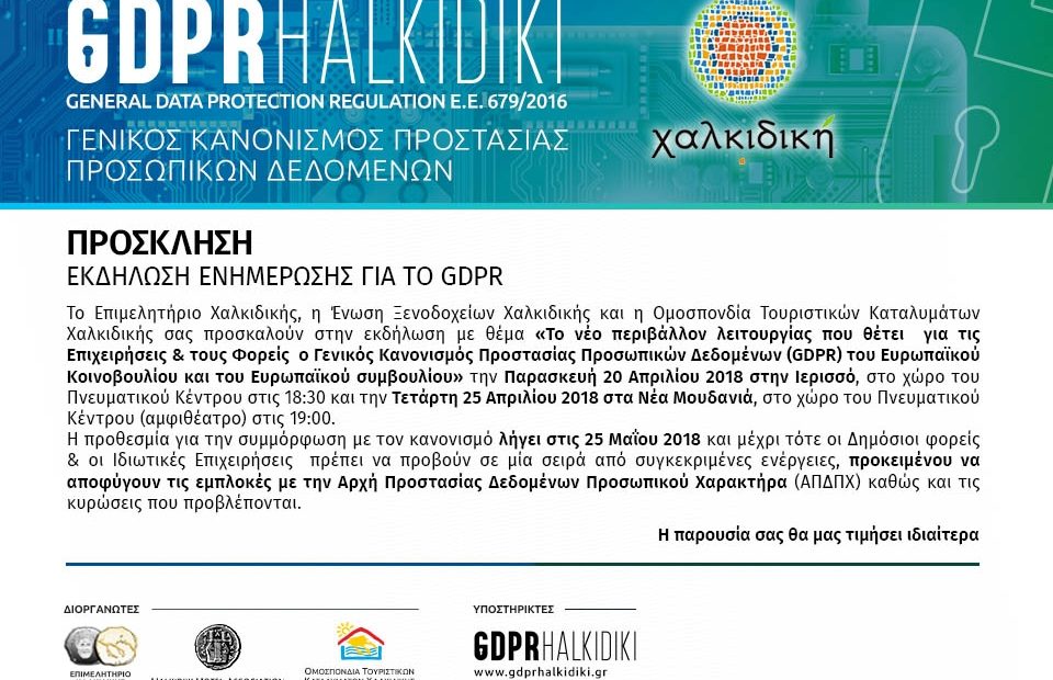 Μετά την πολύ επιτυχημένη ενημερωτική εκδήλωση με θέμα «Το νέο περιβάλλον λειτουργίας που θέτει για τις Επιχειρήσεις και τους Φορείς ο Γενικός Κανονισμός Προστασίας Προσωπικών Δεδομένων – GDPR» που διοργάνωσε το Επιμελητήριο Χαλκιδικής σε συνεργασία με την Ένωση Ξενοδοχείων και με την Ομοσπονδία Τουριστικών Καταλυμάτων Χαλκιδικής την Παρασκευή 13 Απριλίου 2018 στο Συνεδριακό Κέντρο του Επιμελητηρίου Χαλκιδικής, και λόγο ότι το θέμα έχει παρουσιάσει ιδιαίτερο ενδιαφέρον την τελευταία περίοδο, αφού και ο Κανονισμός της ΕΕ θα έχει εφαρμογή άμεσα σε όλα τα κράτη-μέλη της από 25/5/2018 και θα αντικαταστήσει την ισχύουσα νομοθεσία που είχε εφαρμοστεί πριν πολλά χρόνια με τον Ν. 2472/1999, προγραμματίζονται δύο επιπλέον ενημερωτικές εκδηλώσεις :