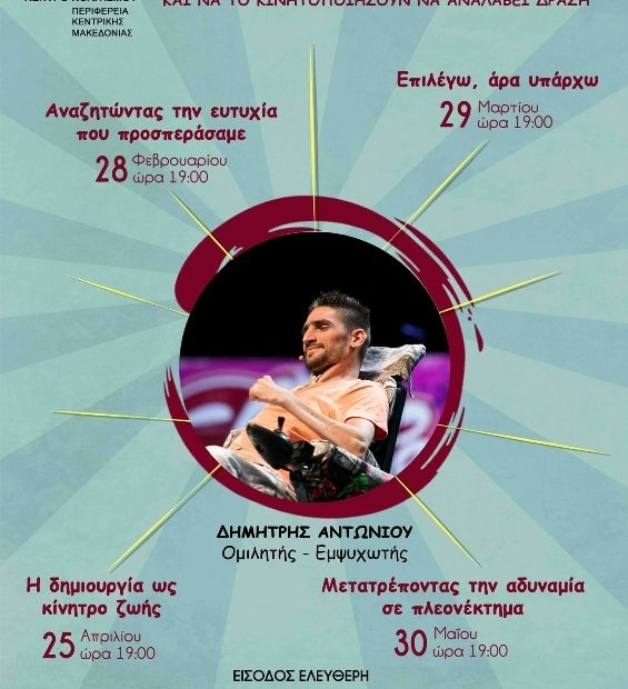 Το Κέντρο Πολιτισμού της Περιφέρειας Κεντρικής Μακεδονίας διοργανώνει σεμινάρια αυτοβελτιώσης με τον Δημήτρη Αντωνίου. Το 3ο σεμινάριο έχει τίτλο : «Η δημιουργία ως κίνητρο ζωής» και σκοπό έχει να αφυπνίσει το κοινό και να το κινητοποιήσει να αναλάβει δράση.