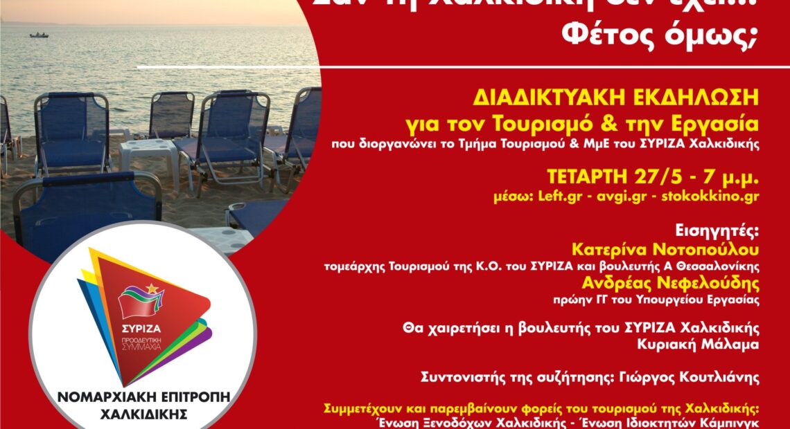 Διαδικτυακή εκδήλωση για τον Τουρισμό & την Εργασία διοργανώνει το Τμήμα Τουρισμού & ΜμΕ του ΣΥΡΙΖΑ Χαλκιδικής την ΤΕΤΑΡΤΗ 27/5 – 7 μ.μ. με εισηγητές την
