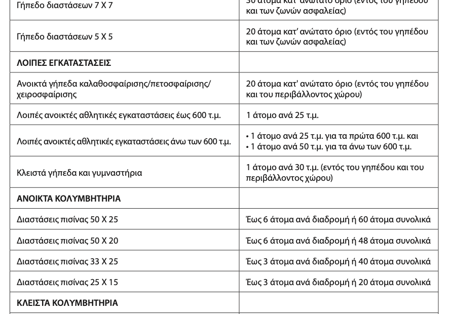 α) Η λειτουργία όλων των ανοικτών αθλητικών εγκαταστάσεων και κολυμβητηρίων και η χρήση τους αποκλειστικά και μόνον για την κάλυψη αναγκών προπόνησης (μόνο με ατομικές προπονήσεις, χωρίς επαφές ή ομαδική άσκηση) από αθλητές σωματείων, Τμημάτων Αμειβομένων Αθλητών (Τ.Α.Α.) και Ανωνύμων Αθλητικών Εταιριών (Α.Α.Ε.) και αθλούμενους ηλικίας δεκατριών (13) ετών και άνω (γεννημένους έως και 31.12.2007) και με τους όρους και τους περιορισμούς που αναφέρονται στο Παράρτημα, το οποίο αποτελεί αναπόσπαστο μέρος της παρούσας. Οι αθλητές όλων των προ-ολυμπιακών και των εθνικών ομάδων κάνουν χρήση των παραπάνω αθλητικών εγκαταστάσεων κατ’ απόλυτη προτεραιότητα.