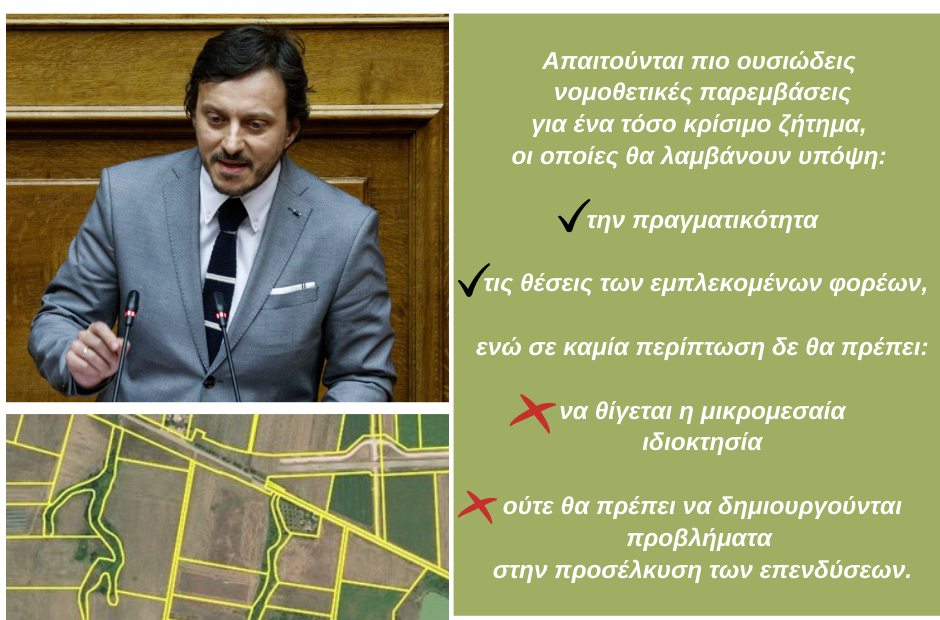 Εν κατακλείδι απαιτούνται πιο ουσιώδεις νομοθετικές παρεμβάσεις για ένα τόσο κρίσιμο ζήτημα, οι οποίες θα λαμβάνουν υπόψη την πραγματικότητα, καθώς και τις θέσεις των εμπλεκομένων φορέων, ενώ σε καμία περίπτωση δεν θα πρέπει να θίγεται η μικρομεσαία ιδιοκτησία εις βάρος της ψευδεπίγραφης προστασίας του περιβάλλοντος. Παράλληλα, δεν θα πρέπει να δημιουργούνται προβλήματα στην προσέλκυση των επενδύσεων, κάτι που έχω τονίσει άλλωστε με τις παρεμβάσεις μου στις διαρκείς επιτροπές και στην Ολομέλεια της Βουλής και πλήττει αναμφίβολα την Χαλκιδική.