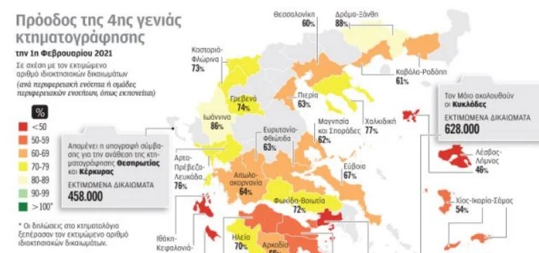 Οσον αφορά την πορεία της κτηματογράφησης, οι περιοχές με τα χαμηλότερα ποσοστά συμμετοχής είναι το υπόλοιπο Δυτικής Αττικής και νήσων Αττικής (35%) και οι περιφερειακές ενότητες Λήμνου/Λέσβου (46%), Ζακύνθου/Κεφαλονιάς/Ιθάκης (49%), Αργολίδας/Κορινθίας (51%), Σάμου/Χίου/Ικαρίας και Λακωνίας (54%). Αντίθετα στις περιφερειακές ενότητες Καλύμνου/Καρπάθου/Κω/Ρόδου οι δηλώσεις έχουν ξεπεράσει τις εκτιμώμενες (105,4%), ενώ έχει ξεπεράσει το 80% σε Δράμα/Ξάνθη, Ιωάννινα, Λασίθι και Λάρισα. Σύμφωνα με τον προγραμματισμό, τις επόμενες ημέρες ξεκινάει η συλλογή δηλώσεων ιδιοκτησίας στην περιφερειακή ενότητα Ρεθύμνου και τον Μάιο ακολουθούν οι Κυκλάδες. Χανιά και (υπόλοιπο) Ηράκλειο θα ξεκινήσουν τον Αύγουστο, ενώ η μελέτη Θεσπρωτίας/Κέρκυρας παραμένει «ορφανή» αναμένοντας την τελευταία απόφαση του ΣτΕ (πιθανότατα εντός των ημερών).
