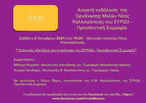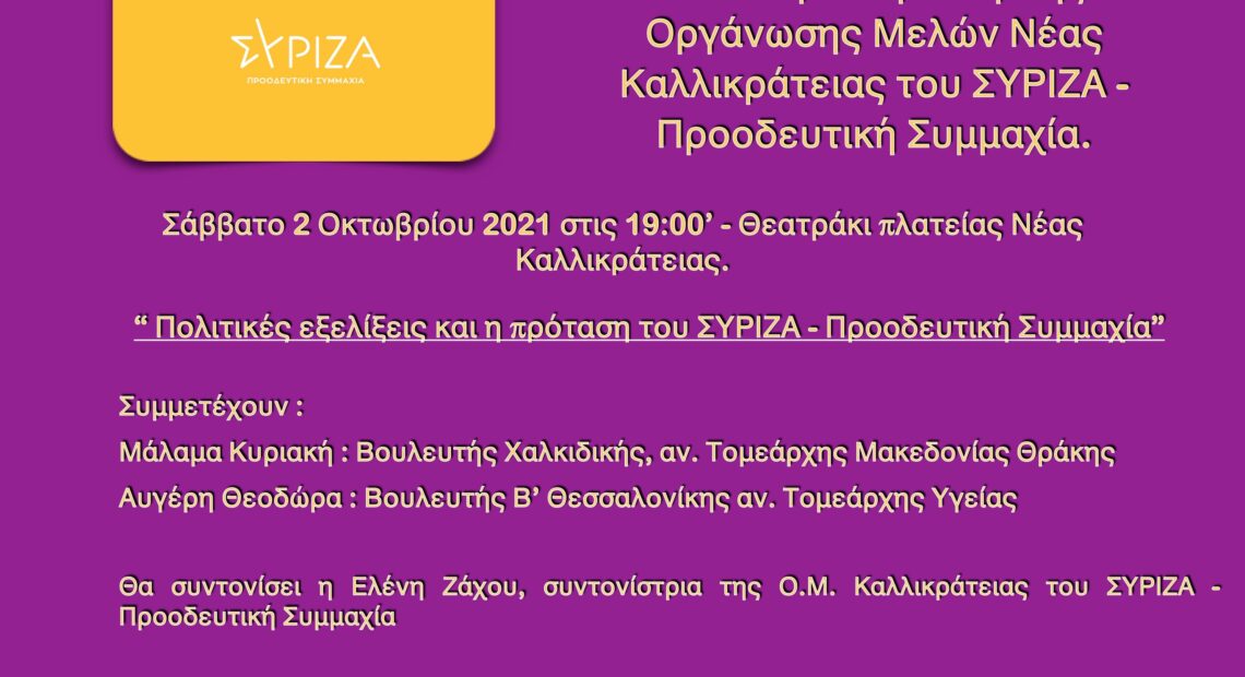 Πρόσκληση για την ανοικτή συζήτηση που διοργανώνει η Οργάνωση Μελών Νέας Καλλικράτειας του ΣΥΡΙΖΑ – Προοδευτική Συμμαχία για το Σάββατο 2 Οκτωβρίου και ώρα 19:00 στο θεατράκι της πλατείας της Νέας Καλλικράτειας.