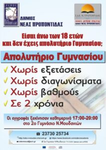 Αγαπητές φίλες και αγαπητοί φίλοι, οι εγγραφές στο σχολείο δεύτερης ευκαιρίας Ν. Προποντίδας συνεχίζονται κανονικά. Το σχολείο μας δίνει τη δεύτερη ευκαιρία στη μάθηση σε ενήλικες άνω των 18 ετών.