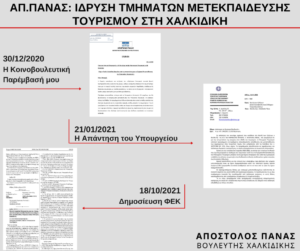 Με την υπ.αριθμ.πρωτ.:2992/30-12-20 κοινοβουλευτική παρέμβαση του ο Γραμματέας της Βουλής και Βουλευτής Χαλκιδικής Πάνας Απόστολος αιτήθηκε από το Υπουργείο Τουρισμού, να ιδρυθούν στη Χαλκιδική Τμήματα Μετεκπαίδευσης Τουρισμού, καθώς σε σχετικές ανακοινώσεις τα τελευταία χρόνια δεν περιλαμβάνονταν στις υποψήφιες περιοχές.