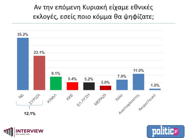 Δημοσκόπηση Interview για την politic.gr: Στις 12 ποσοστιαίες μονάδες η διαφορά ΝΔ – ΣΥΡΙΖΑ – Άνοδος ποσοστών του ΚΙΝΑΛ