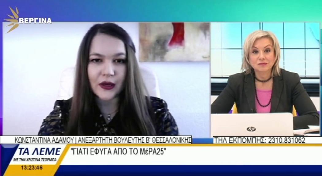Για μπούλινγκ, τραμπουκισμούς, mobbing, καταπάτηση ανθρωπίνων δικαιωμάτων και έλλειψη σεβασμού από το ΜέΡΑ25, έκανε λόγο η ανεξάρτητη βουλευτής Β’ Θεσσαλονίκης Κωνσταντίνα Αδάμου, μιλώντας στη Βεργίνα Τηλεόραση και την εκπομπή «Τα Λέμε» με τη δημοσιογράφο Χριστίνα Τσόρμπα.