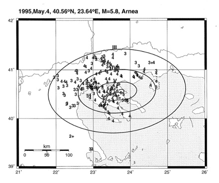 Η σεισμική δόνηση (Μ=5,8) που σημειώθηκε στις 4 Μαΐου του 1995 έπληξε τη Χαλκιδική και τις γύρω περιοχές. Οι εντάσεις στην πλειόσειστη περιοχή έφτασαν το VΙ.
