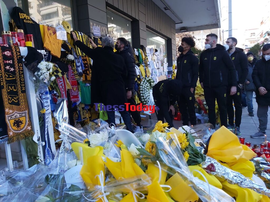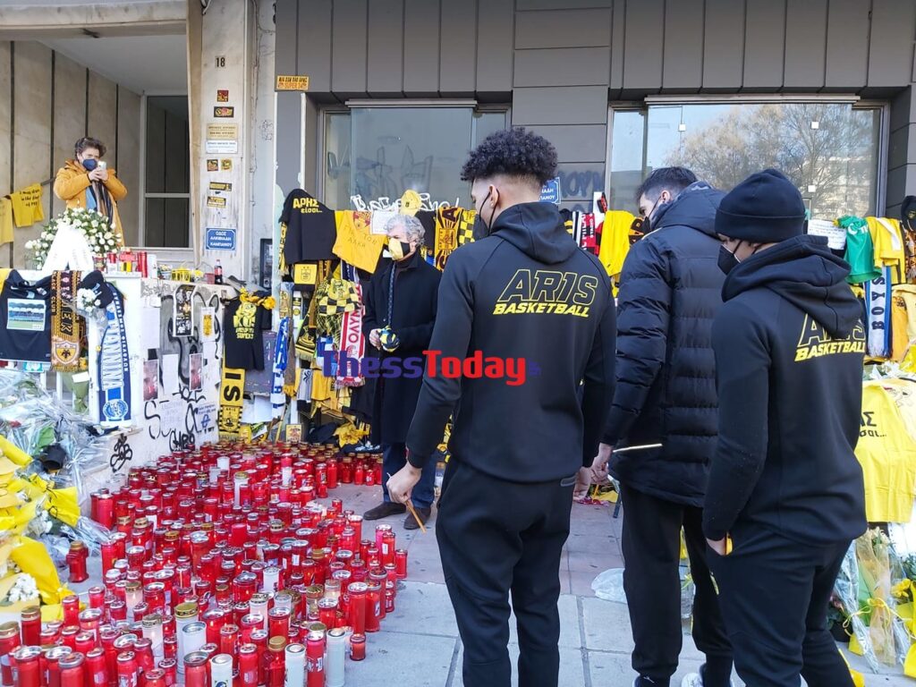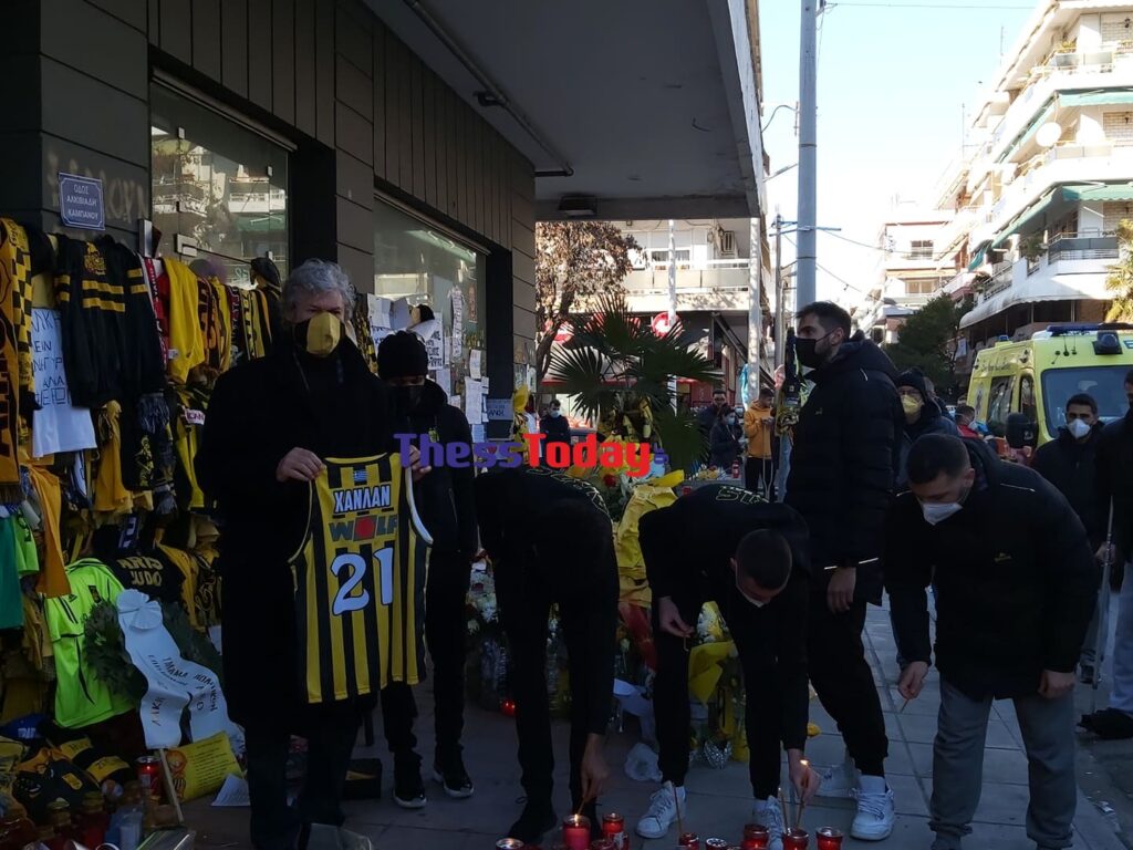 Ο πρόεδρος μαζί με τους παίκτες άφησαν στην οδό Αλκιβιάδη Καμπανού- πήρε πλέον την ονομασία του 19χρονου- τη φανέλα του αρχηγού του Άρη, Ολιβιέ Χανλαν υπογεγραμμένη απ’ όλους τους παίκτες.