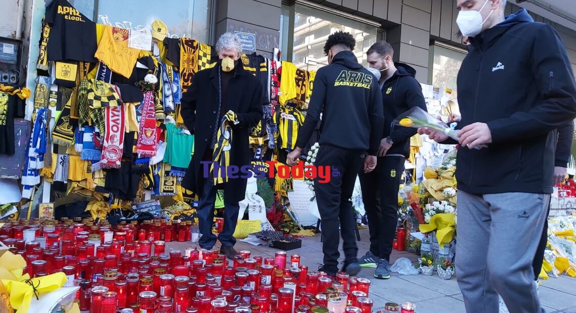 Ο πρόεδρος μαζί με τους παίκτες άφησαν στην οδό Αλκιβιάδη Καμπανού- πήρε πλέον την ονομασία του 19χρονου- τη φανέλα του αρχηγού του Άρη, Ολιβιέ Χανλαν υπογεγραμμένη απ’ όλους τους παίκτες.