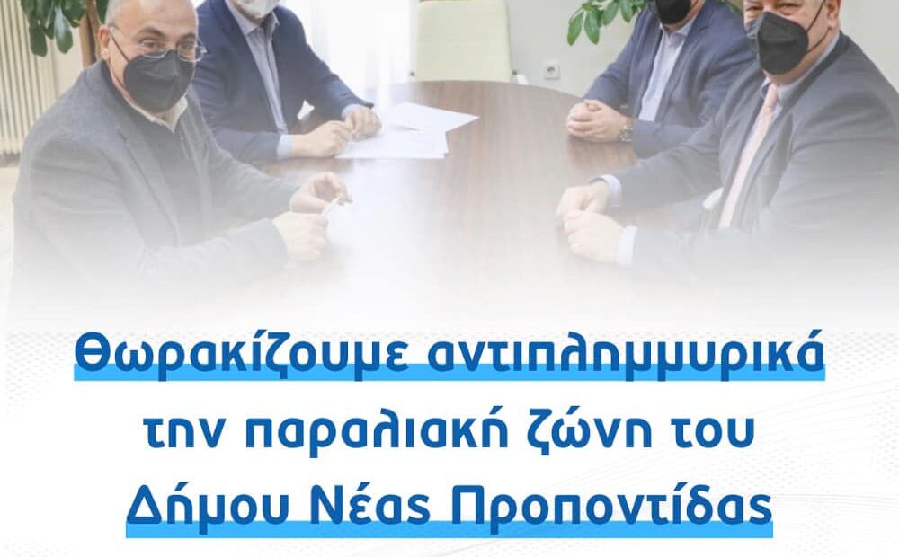 Προγραμματική σύμβαση για την αντιπλημμυρική θωράκιση της παραλιακής ζώνης του Δήμου Νέας Προποντίδας Χαλκιδικής υπέγραψαν σήμερα στο κτίριο διοίκησης της Περιφέρειας Κεντρικής Μακεδονίας, ο Περιφερειάρχης Απόστολος Τζιτζικώστας και ο Δήμαρχος Εμμανουήλ Καρράς.