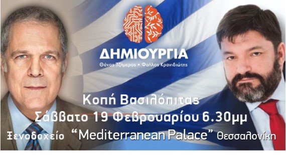 Το Σάββατο, 19 Φεβρουαρίου 2022, ώρα 7 μ.μ., στο ξενοδοχείο MEDITERRANEAN PALACE HOTEL της Θεσσαλονίκης, θα πραγματοποιηθεί η κοπή βασιλόπιτας του κομματικού συνασπισμού «ΔΗΜΙΟΥΡΓΙΑ», παρουσία του Προέδρου Θάνου Τζήμερου, με διαδικτυακή συμμετοχή του Φαήλου Κρανιδιώτη.