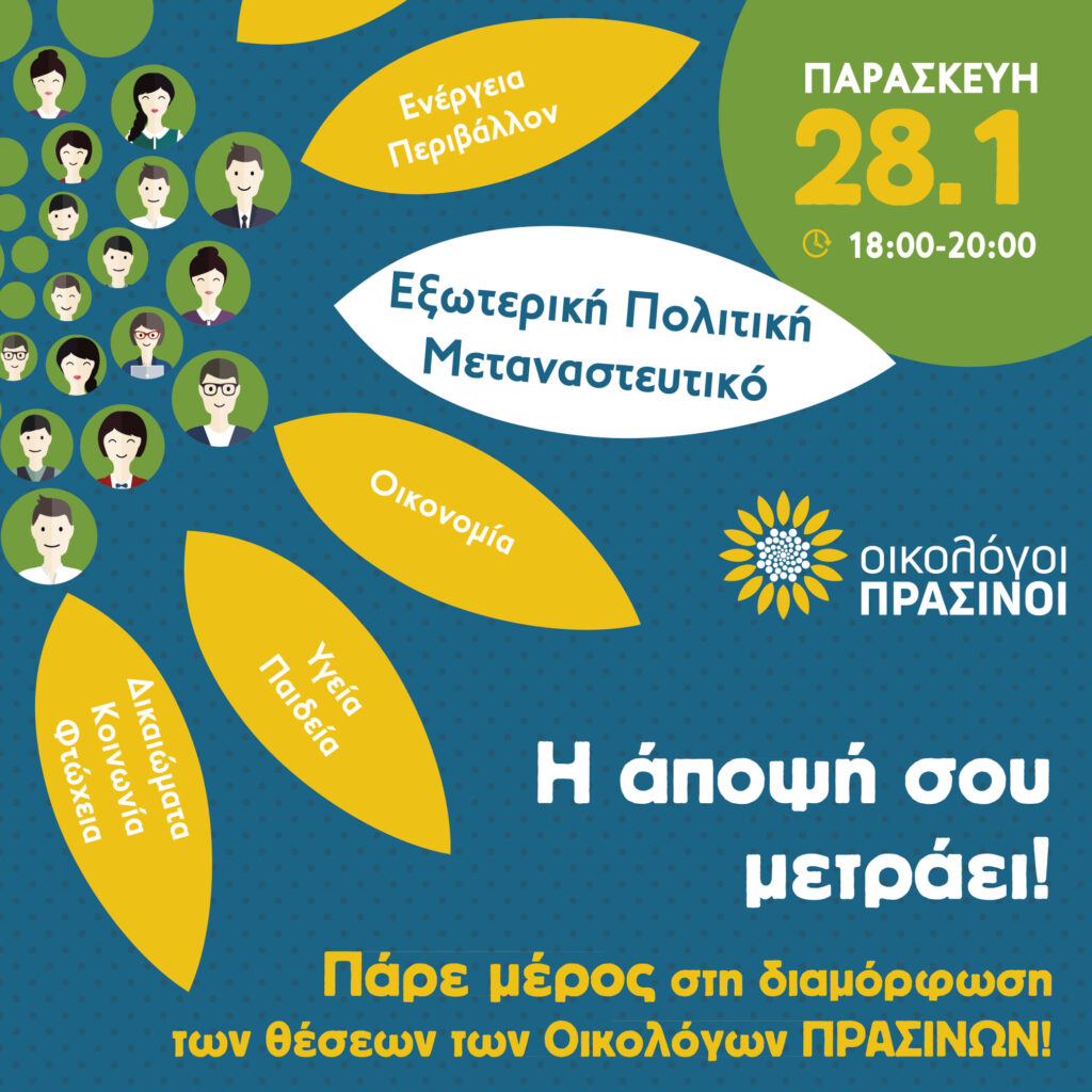 Αν πιστεύεις ότι μπορείς να συνεισφέρεις σε ένα καλύτερο αύριο, τότε λάβε μέρος στη διαμόρφωση και επικαιροποίηση των πολιτικών θέσεων των Οικολόγων ΠΡΑΣΙΝΩΝ.