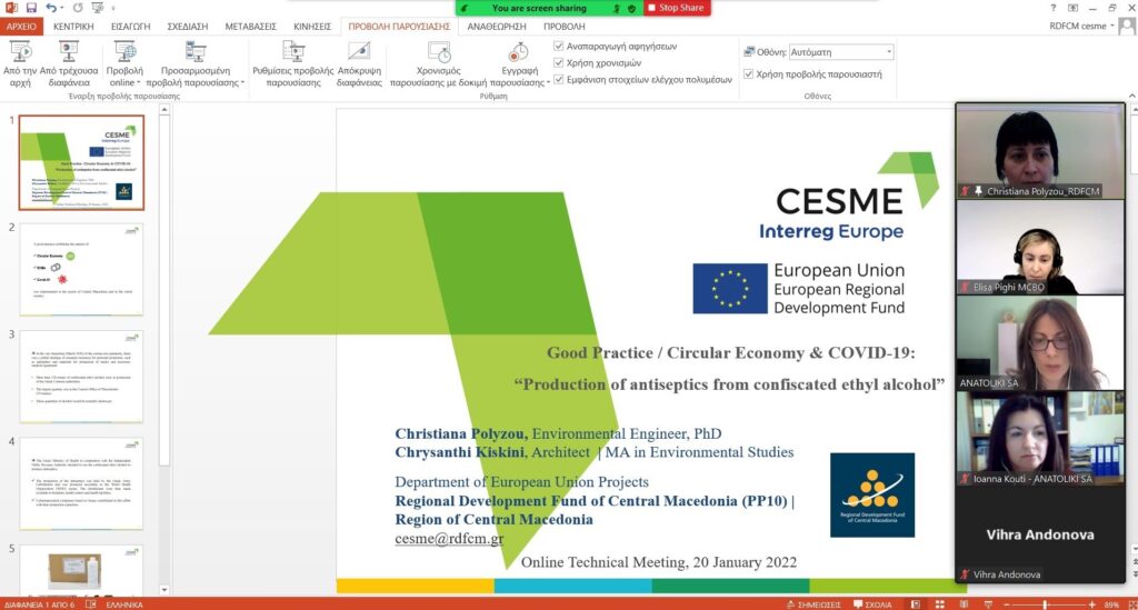 Οι συνέπειες της πανδημίας στις Μικρομεσαίες Επιχειρήσεις καθώς και οι καλές πρακτικές ανάκαμψής τους μέσω της κυκλικής οικονομίας βρέθηκαν στο επίκεντρο της διαδικτυακής τεχνικής συνάντησης των εταίρων του έργου “CESME+, Κυκλική Οικονομία για Μικρές και Μεσαίες Επιχειρήσεις / Circular Economy for SMEs“, στην οποία συμμετείχαν το Περιφερειακό Ταμείο Ανάπτυξης Κεντρικής Μακεδονίας για λογαριασμό της Περιφέρειας Κεντρικής Μακεδονίας και η ΑΝΑΤΟΛΙΚΗ Α.Ε. (επικεφαλής εταίρος).
