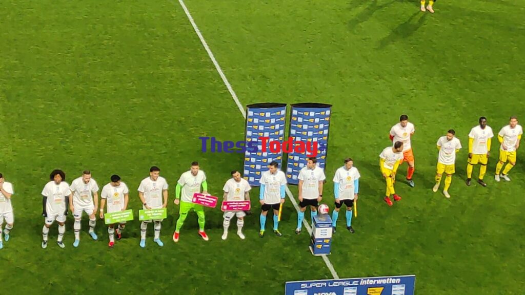 Και οι 22 ποδοσφαιριστές φορούσαν φανέλες με μήνυμα κατά της οπαδικής βίας, ενώ ο Βιεϊρίνια την ώρα που πήγαινε να καταθέσει στεφάνι στη μνήμη του Άλκη, στη Θύρα 3, έγινε δέκτης αποδοκιμασιών από τους φιλάθλους του Άρη.
