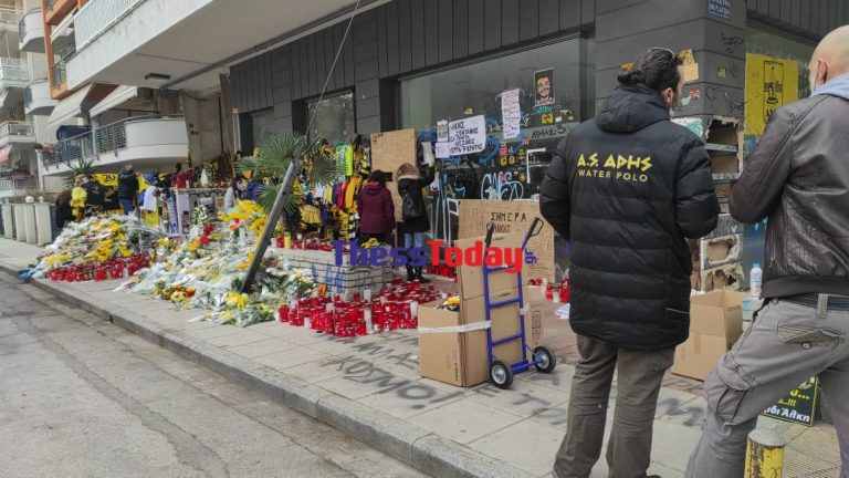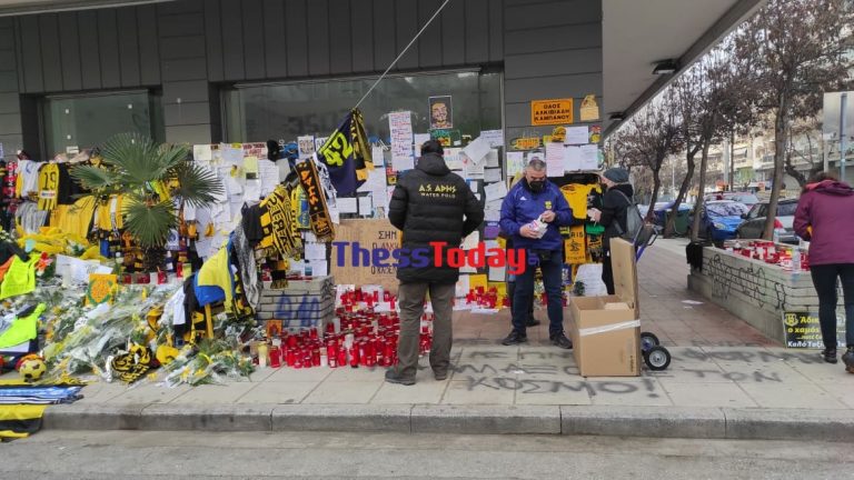 Εκπρόσωποι του Ερασιτέχνη Άρη έφτασαν στο σημείο από νωρίς το πρωί της Δευτέρας και με αφορμή την επικείμενη καταιγίδα που ενδεχομένως «χτυπήσει» με δυνατούς ανέμους και βροχοπτώσεις την πόλη της Θεσσαλονίκης, αποφάσισαν να προστατεύσουν τα εκατοντάδες αντικείμενα που συγκεντρώθηκαν στη μνήμη του Άλκη, πλην των κεριών και των λουλουδιών.