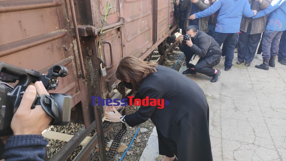 Μετά το πέρας της ομιλίας της, κατευθύνθηκε προς τα βαγόνια και τοποθέτησε ένα κόκκινο γαρύφαλλο όπως και ένα κερί εις μνήμην των θυμάτων.