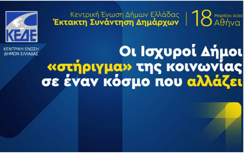 Έκτακτη Συνάντηση Δημάρχων συγκαλεί η ΚΕΔΕ μεθαύριο Παρασκευή 18 Μαρτίου 2022, προκειμένου να συζητηθούν και να ληφθούν αποφάσεις για κρίσιμα ζητήματα που  …