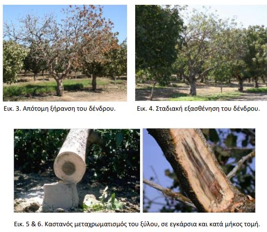 Σε κατά μήκος ή εγκάρσια τομή ενός προσβεβλημένου κλάδου παρατηρείται σκούρος καστανός μεταχρωματισμός του ξύλου, χωρίς όμως αυτό να αποτελεί κανόνα στη φιστικιά (εικόνες 5 & 6).