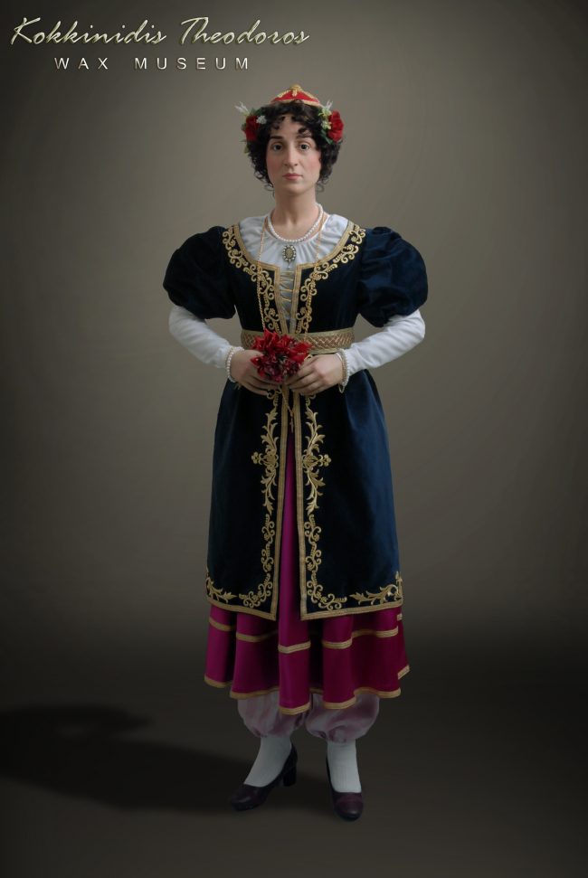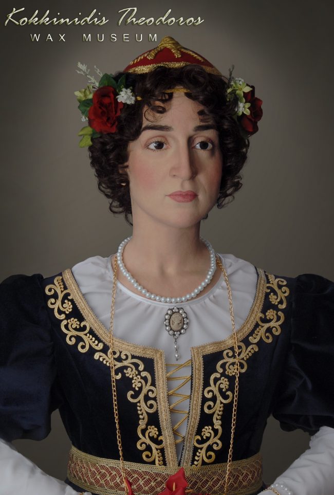 Το έργο της και η συμβολή της στην Ελληνική Επανάσταση είναι τεράστια, πολεμώντας με πολλούς τρόπους για τον μεγάλο σκοπό. Διέθεσε όλη της την περιουσία για τον Αγώνα και επειδή ήταν πολύ μορφωμένη επηρέασε τους φιλέλληνες της Ευρώπης για να στηρίξουν την προσπάθεια των Ελλήνων. Αυτό θέλησε να αποτυπώσει στο κέρινο ομοίωμά της ο Θεόδωρος Κοκκινίδης μαζί με την ευγενική της προσωπικότητα, την ευαισθησία και τον δυναμισμό που χαρακτήριζαν την ίδια. Όπως εξήγησε ο ίδιος, ήθελε να φαίνεται η ευγενική της προσωπικότητα και η καλή καταγωγή της (ο πατέρας της ήταν υπασπιστής του του ηγεμόνα της Μολδαβίας και η μητέρα της ήταν δραστήρια γυναίκα που διηύθυνε εκεί τις εμπορικές υποθέσεις του άντρα της)  και αυτό αποτυπώθηκε στην επιδερμίδα του έργου αλλά και στη φορεσιά.Το έργο της και η συμβολή της στην Ελληνική Επανάσταση είναι τεράστια, πολεμώντας με πολλούς τρόπους για τον μεγάλο σκοπό. Διέθεσε όλη της την περιουσία για τον Αγώνα και επειδή ήταν πολύ μορφωμένη επηρέασε τους φιλέλληνες της Ευρώπης για να στηρίξουν την προσπάθεια των Ελλήνων. Αυτό θέλησε να αποτυπώσει στο κέρινο ομοίωμά της ο Θεόδωρος Κοκκινίδης μαζί με την ευγενική της προσωπικότητα, την ευαισθησία και τον δυναμισμό που χαρακτήριζαν την ίδια. Όπως εξήγησε ο ίδιος, ήθελε να φαίνεται η ευγενική της προσωπικότητα και η καλή καταγωγή της (ο πατέρας της ήταν υπασπιστής του του ηγεμόνα της Μολδαβίας και η μητέρα της ήταν δραστήρια γυναίκα που διηύθυνε εκεί τις εμπορικές υποθέσεις του άντρα της)  και αυτό αποτυπώθηκε στην επιδερμίδα του έργου αλλά και στη φορεσιά.