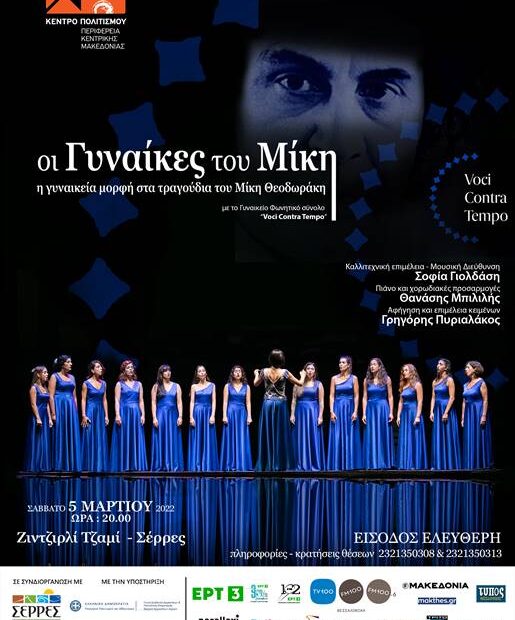 Το Γυναικείο φωνητικό Σύνολο “Voci Contra Tempo”, φιλοδοξεί να μοιραστεί με το κοινό των Σερρών μία ιδιαιτέρως ενδιαφέρουσα προσέγγιση στο έργο του Μίκη Θεοδωράκη, με αφορμή την αποδημία του κορυφαίου συνθέτη τη χρονιά που μας πέρασε, αλλά και τον εορτασμό της ημέρας της γυναίκας.