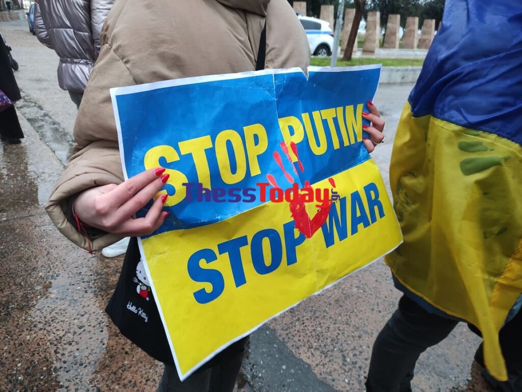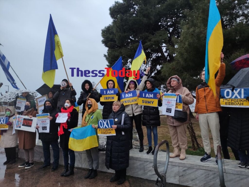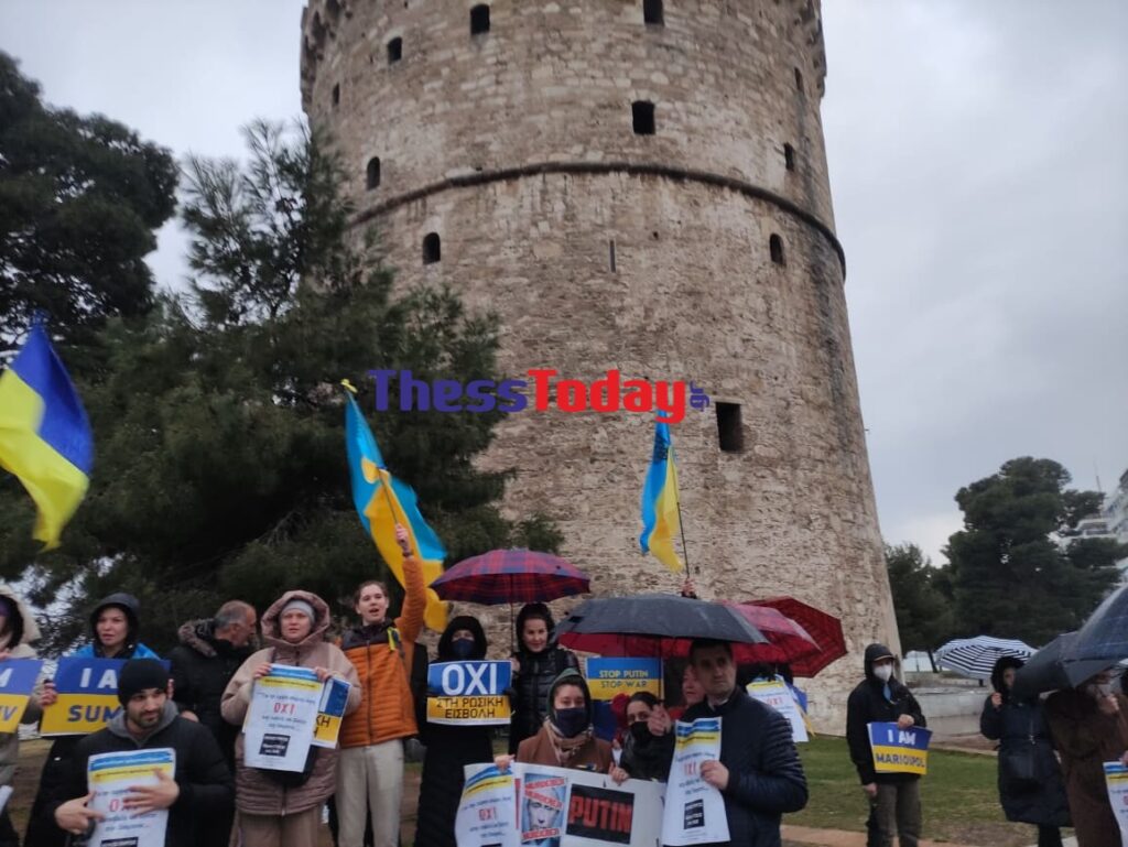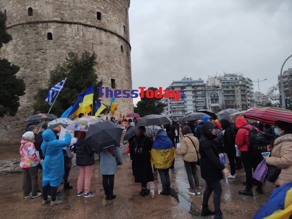 Παρά το κρύο και τη βροχή, πολίτες της Θεσσαλονίκης έχουν συγκεντρωθεί με σημαίες και πλακάτ και φωνάζουν συνθήματα υπέρ της Ουκρανίας που υφίσταται για περισσότερες από 20 μέρες τη ρωσική εισβολή.