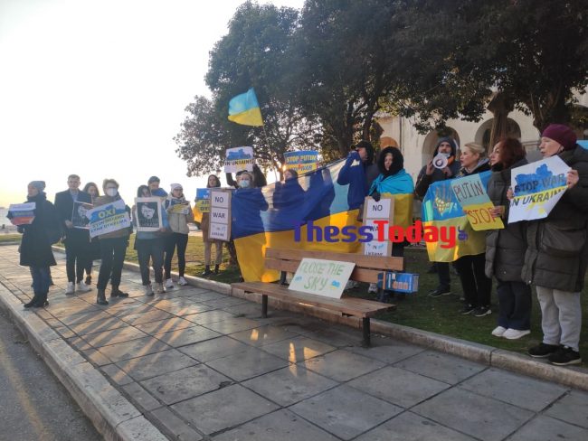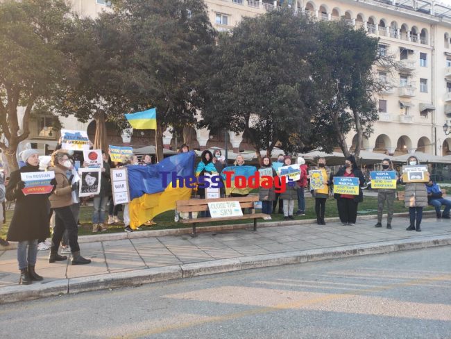Για άλλη μία φορά συγκεντρώθηκαν στην πλατεία Αριστοτέλους κρατώντας αντιπολεμικές αφίσες, αλλά και πλακάτ, όπως και ουκρανικές σημαίες.