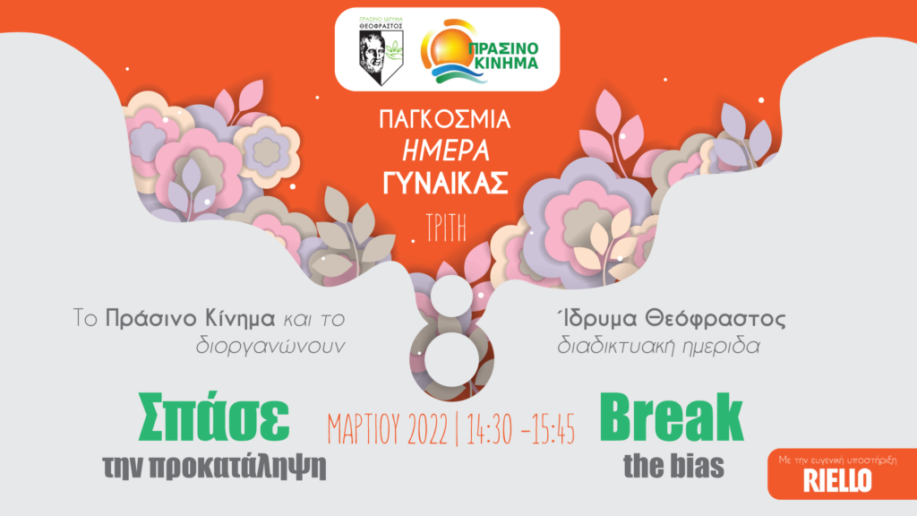 Τέρμα στην κάθε μορφή βίας κατά των γυναικών, στην προκατάληψη, στα στερεότυπα… Με όραμα έναν κόσμο όπου η γυναικεία φωνή θα αξιοποιείται ισότιμα γι’ αυτά που προσφέρει κι όχι μόνο να υψώνεται για να διεκδικεί μια… ημιτελή ισότητα, και στα πλαίσια του εορτασμού της Παγκόσμιας Ημέρας της Γυναίκας, το Πράσινο Κίνημα και το Ίδρυμα Θεόφραστος, διοργάνωσαν από κοινού διαδικτυακή ημερίδα την 8η Μαρτίου, με τίτλο «Σπάσε την προκατάληψη».