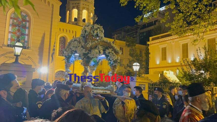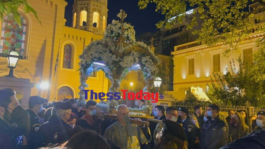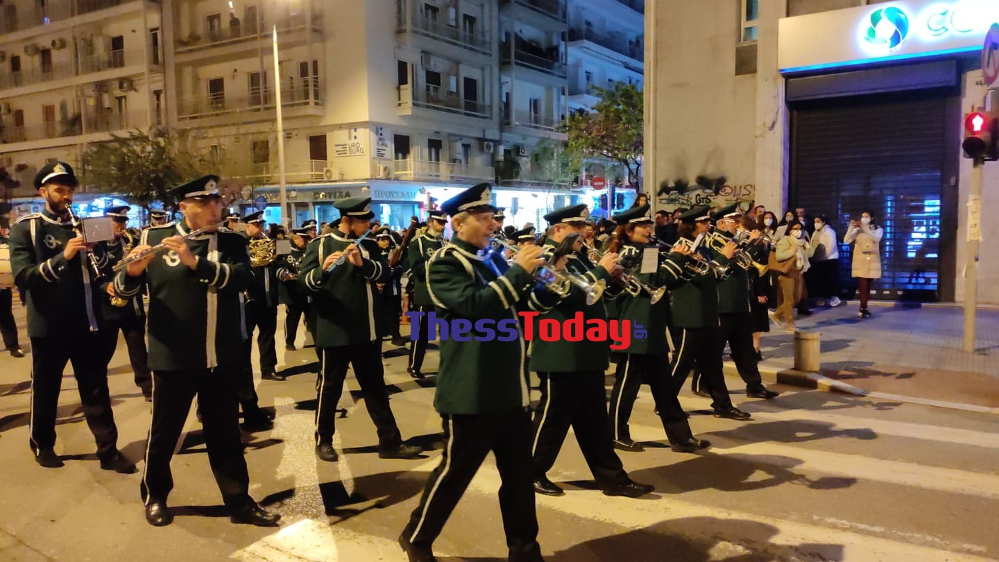 Υπό τους ήχους της μπάντας του Ελληνικού Στρατού ο Επιτάφιος κατευθύνεται προς τη λεωφόρο Νίκης και μέσω της Βογατσικού θα επιστρέψει ξανά στην Τσιμισκή.