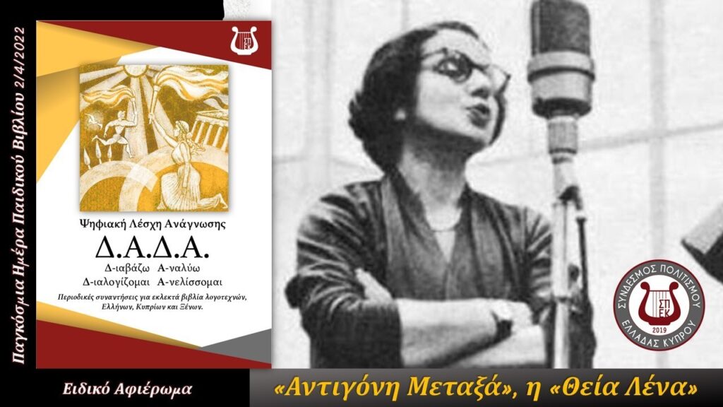 ΣΤΟ ΠΑΡΟΝ ΒΙΝΤΕΟ, κάνοντας ΚΛΙΚ ΕΔΩ, ΑΛΛΑ ΚΑΙ στο Δελτίο Τύπου ΕΔΩ παρακολουθούμε τη διεξαγωγή της 5ΗΣ Συνάντησης της Ψηφιακής Λέσχης Ανάγνωσης ΔΑΔΑ του Συνδέσμου Πολιτισμού Ελλάδας Κύπρου, αφιερωμένης στη μνήμη της μεγάλης παιδαγωγού Αντιγόνης Μεταξά, της αγαπημένης μας “Θείας Λένας”. Όλοι οι συμμετέχοντες διηγήθηκαν / διάβασαν αγαπημένα τους παραμύθια από την παιδική τους ηλικία και αναφέρθηκαν σε ιστορίες από τα παλιά, καθώς και στα ηθικά τους διδάγματα. Παρακάτω ακολουθεί το βίντεο αφιέρωμα της εκδήλωσης στη μνήμη της “Θείας Λένας” Αντιγόνης Μεταξά, με αφορμή τον εορτασμό της Παγκόσμιας Ημέρας Παιδικού Βιβλίου.