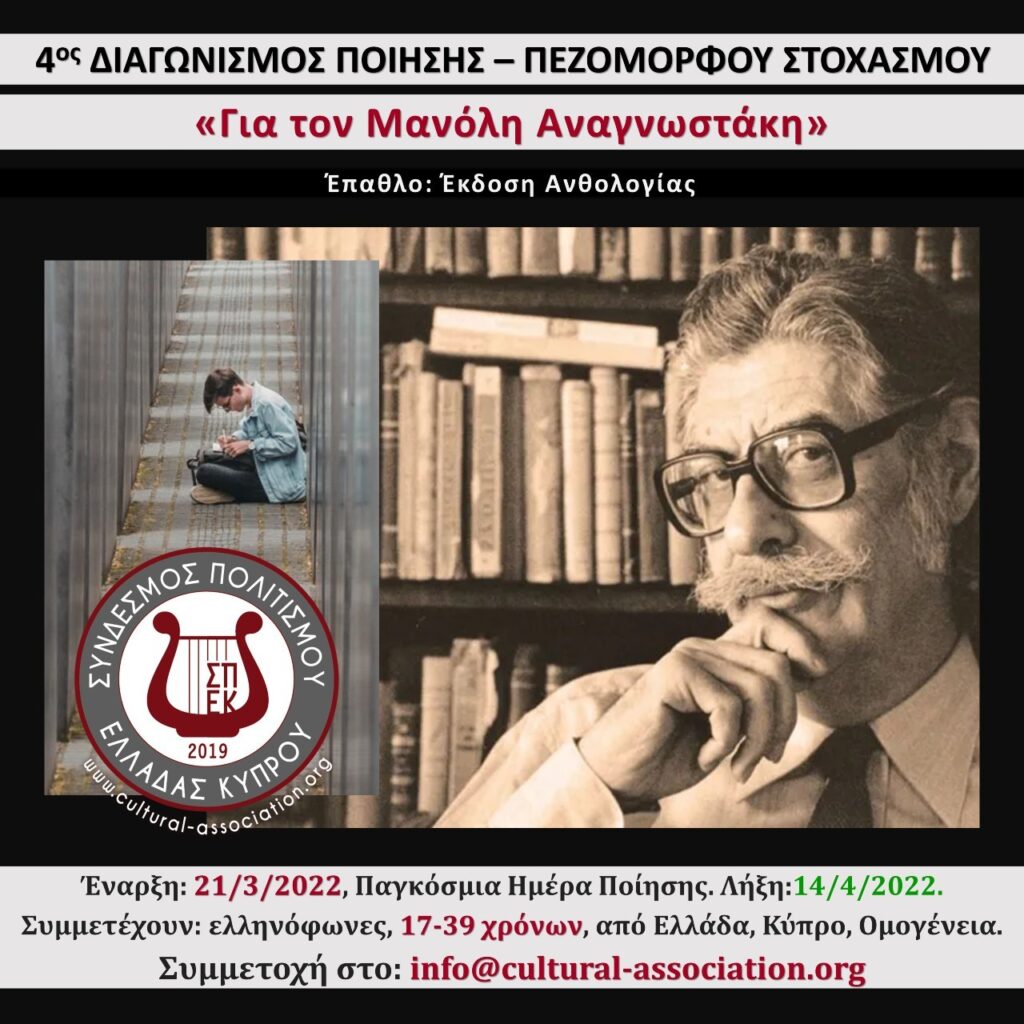 ΕΔΩ ΔΙΑΒΑΖΟΥΜΕ το Δελτίο Τύπου με όλες τις απαραίτητες πληροφορίες και τα δεδομένα του Διαγωνισμού στη μνήμη του μεγάλου μας ποιητή Μανόλη Αναγνωστάκη με έπαθλο την έκδοση ανθολογίας από τον ΣΠΕΚ. ΔΕΧΤΕΣ ΣΥΜΜΕΤΟΧΕΣ ΜΕΧΡΙ 20/4/2022.