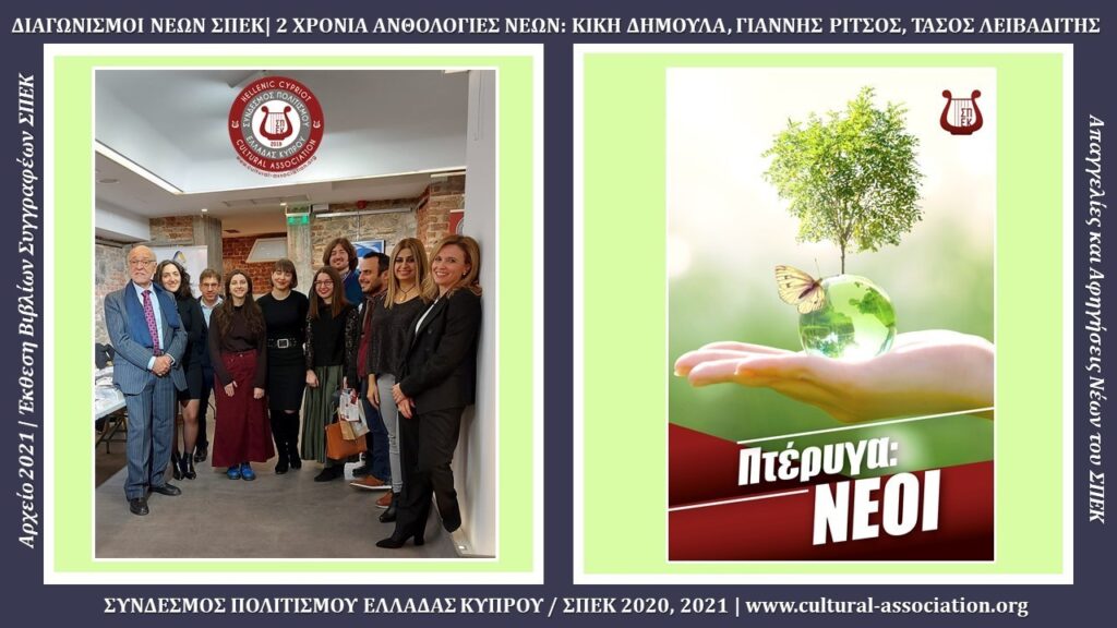 Στο ανωτέρω βίντεο αλλά και ΕΔΩ βλέπουμε και ακούμε την Κατσαβριά Κωνσταντίνα, τον Ιωάννη Γκόγκουλη, τη Γεωργία Βασιλειάδου, την Έφη Βούζιου, την Ίριδα Μίχου, τον Λάκκα Αργύρη, τη Γκλιάτη Ειρήνη, τον Γαβριήλ Αλεξανδρίδη και τον Μαυροματάκη Κωνσταντίνο, νέους και νέες από διάφορα μέρη της Ελλάδας, αλλά και της Κύπρου, που έδωσαν ενεργά το παρόν στην Έκθεση Βιβλίων Συγγραφέων του Συνδέσμου Πολιτισμού Ελλάδας Κύπρου για το 2021 και συμμετείχαν στην Παρουσίαση των τριών ανθολογιών του ΣΠΕΚ για την Κική Δημουλά, τον Τάσο Λειβαδίτη και τον Γιάννη Ρίτσο. Οι συγκεκριμένοι νέοι, καθώς και άλλοι πολλοί, συμμετείχαν στου διαγωνισμούς ποίησης – πεζόμορφου στοχασμού του Συνδέσμου Πολιτισμού Ελλάδας Κύπρου κατά τα έτη 2020-2021 και διακρίθηκαν με έπαθλο την έκδοση τριών ανθολογιών ποίησης. Στο παρόν βίντεο – αφιέρωμα απαγγέλουν / αφηγούνται το έργο της συμμετοχής τους και παράλληλα να μιλούν για τον Θεσμό του Συνδέσμου Πολιτισμού Ελλάδας Κύπρου και την αξία της Πτέρυγας Νέων του ΣΠΕΚ.