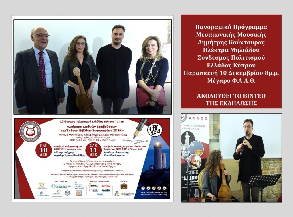 Δύο ειδικευμένοι δεξιοτέχνες μουσικοί της λεγόμενης «παλαιάς μουσικής» και μέλη του διεθνούς συνόλου Ex Silentio, ο Δημήτρης Κούντουρας (μεσαιωνικά φλάουτα) και η Ηλέκτρα Μηλιάδου (βιέλα), παρουσίασαν την Παρασκευή 10 Δεκεμβρίου στις 20:00, στο πλαίσιο των Διεθνών Βραβεύσεων και της Έκθεσης Βιβλίων Συγγραφέων του Συνδέσμου Πολιτισμού Ελλάδας Κύπρου | ΣΠΕΚ για το 2021, στην αίθουσα τέχνης της Φιλοπτώχου Αδελφότητος Ανδρών Θεσσαλονίκης (Αγίας Σοφίας 38), ένα εκλεκτό, πανοραμικό πρόγραμμα μεσαιωνικής μουσικής. Περιλάμβανε έργα του μεγάλου Γάλλου ποιητή-συνθέτη Γκιγιώμ ντε Μασώ, από Ιταλούς συνθέτες της Ars Nova καθώς και έργα από τον πολύτιμο κώδικα της Κύπρου. Το μουσικό αυτό αφιέρωμα επέλεξε ο Σύνδεσμος Πολιτισμού Ελλάδας Κύπρου για να τιμήσει τον Ομότιμο Καθηγητή Βάλτερ Πούχνερ και τον Μουσικοσυνθέτη Μιχάλη Χριστοδουλίδη, στους οποίους απονεμήθηκε από τον ΣΠΕΚ το Βραβείο Ανθρωπισμού για το 2021. ΔΙΑΒΑΖΟΥΜΕ ΕΔΩ ΤΟ ΔΕΛΤΙΟ ΤΥΠΟΥ ΤΗΣ ΕΚΔΗΛΩΣΗΣ. | Το βίντεο στο YouTube