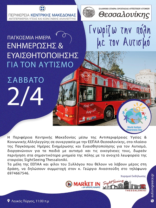 Η Περιφέρεια Κεντρικής Μακεδονίας και η Αντιπεριφέρεια Υγείας και Κοινωνικής Αλληλεγγύης, σε συνεργασία με την Ελληνική Εταιρεία Προστασίας Αυτιστικών Ατόμων -Παράρτημα Θεσσαλονίκης στο πλαίσιο της Παγκόσμιας Ημέρας Ενημέρωσης και Ευαισθητοποίησης για τον Αυτισμό, που έχει καθιερωθεί να είναι η 2α Απριλίου, διοργανώνουν για τα παιδιά με Αυτισμό του Συλλόγου, καθώς και τις οικογένειές τους δωρεάν περιήγηση στα σημαντικότερα μνημεία της Θεσσαλονίκης με τα ανοιχτά λεωφορεία «Sight Seeing Thessaloniki».