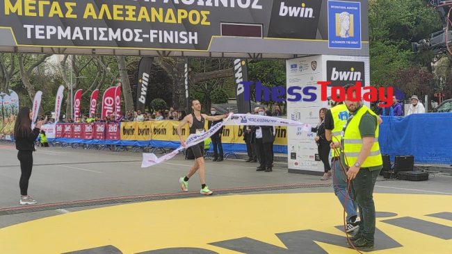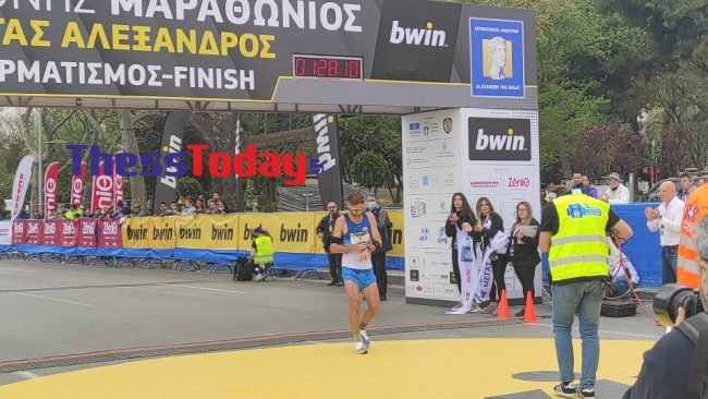 Ο Γιώργος Καλαπόδης έκοψε πρώτος την κορδέλα του τερματισμού του 16ου Διεθνούς Μαραθωνίου «Μέγας Αλέξανδρος» σε χρόνο λιγότερο από δυόμιση ώρες.