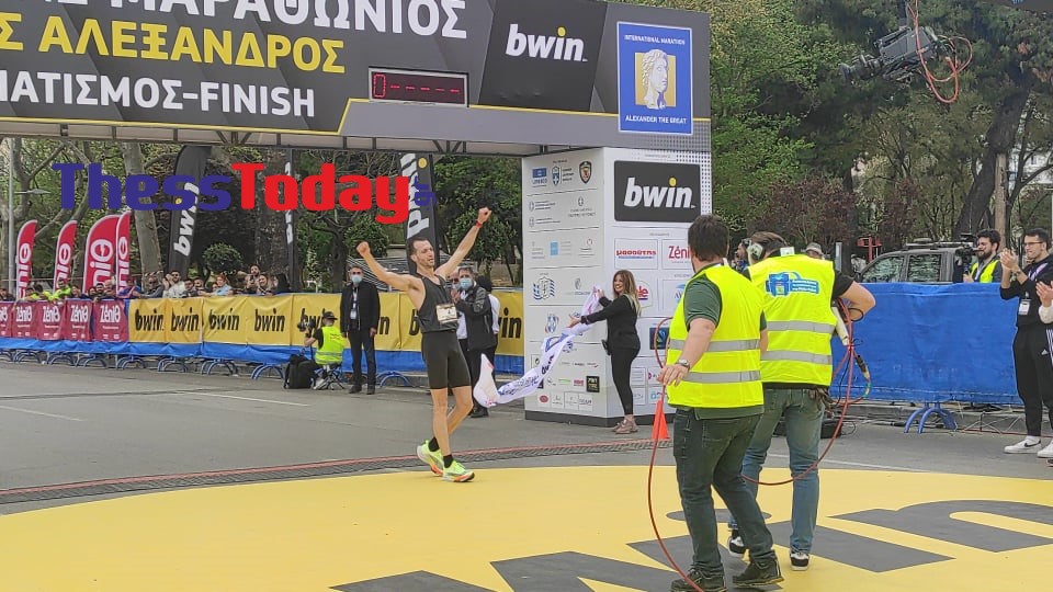 Ο Γιώργος Καλαπόδης έκοψε πρώτος την κορδέλα του τερματισμού του 16ου Διεθνούς Μαραθωνίου «Μέγας Αλέξανδρος» σε χρόνο λιγότερο από δυόμιση ώρες.