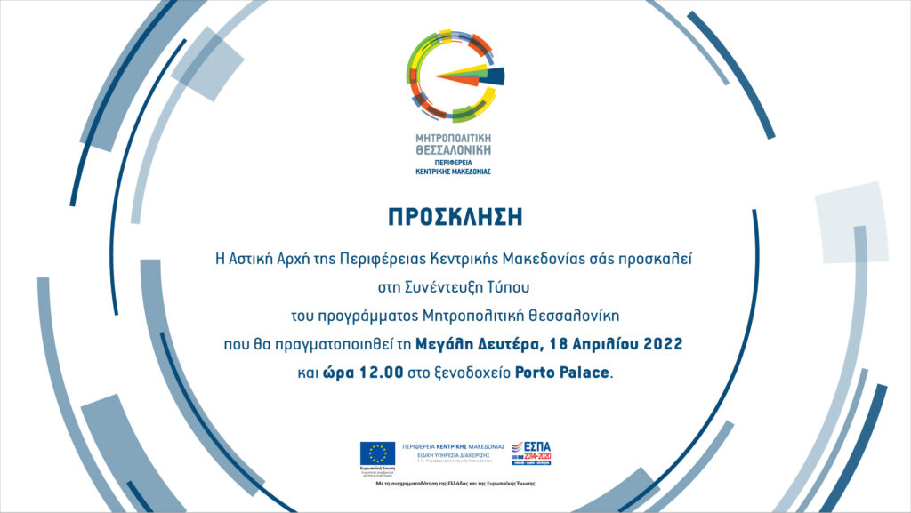 Η Περιφέρεια Κεντρικής Μακεδονίας, σοτ πλαίσιο του Έργου «Μητροπολιτική Θεσσαλονίκη» σας προσκαλεί τη Δευτέρα 18 Απριλίου 2022 σε Συνέντευξη Τύπου, στην οποία θα είναι παρόντες, μεταξύ άλλων, ο Περιφερειάρχης Κ. Μακεδονίας, κος. Απόστολος Τζιτζικώστας, η Αντιπεριφερειάρχης Μητροπολιτικής Ενότητας Θεσσαλονίκης, κα. Βούλα Πατουλίδου, καθώς και οι Δήμαρχοι των δήμων που συμμετέχουν στο έργο «Μητροπολιτική Θεσσαλονίκη».