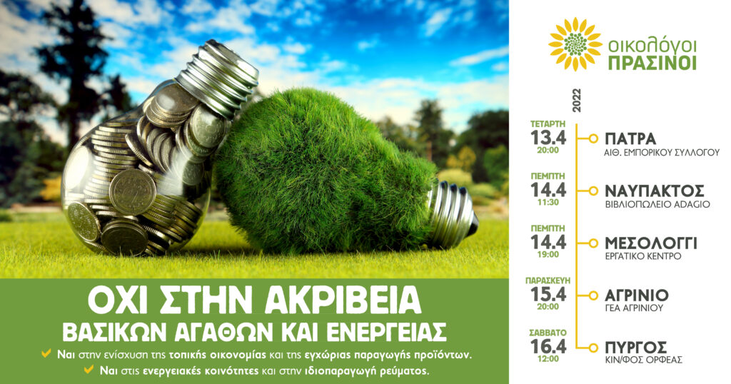 Στόχος της περιοδείας των Οικολόγων ΠΡΑΣΙΝΩΝ είναι η ενημέρωση, η ανταλλαγή απόψεων με τους πολίτες και η ανάδειξη της διαφορετικής πολιτικής πρότασης τους στην αντιμετώπιση της ακρίβειας, στη μείωση του κόστους ρεύματος μέσα από την ιδιοπαραγωγή και την ανάπτυξη ενεργειακών κοινοτήτων, καθώς και στη χρηματοδότηση που θα μπορούσε να προκύψει από την ορθή αξιοποίηση του Ταμείου Ανάκαμψης και Ανθεκτικότητας.