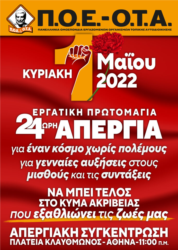 Ανακοινώσεις Δελτίο Τύπου Πολιτική & Οικονομία Π.Ο.Ε.-Ο.Τ.Α. ΓΙΑ ΤΗΝ 24ΩΡΗ ΑΠΕΡΓΙΑ ΤΗΣ ΕΡΓΑΤΙΚΗΣ ΠΡΩΤΟΜΑΓΙΑΣ-ΚΥΡΙΑΚΗ 1 ΜΑΪΟΥ 2022. Πλοήγηση άρθρων Προηγούμενο Previous post: Πού «ποντάρουν» επιχειρηματίες και κάτοικοι για την ανάκαμψη της Βόρειας Εύβοιας-Ο ρόλος του τουρισμούΕπόμενο Next post: Πού «ποντάρουν» επιχειρηματίες και κάτοικοι για την ανάκαμψη της Βόρειας Εύβοιας-Ο ρόλος του τουρισμού ΣΧΕΤΙΚΑ ΑΡΘΡΑ Λευτέρης Αυγενάκης: Το μνημόνιο συνεργασίας με την Τουρκία ανοίγει νέους ορίζοντες στον πρωτογενή τομέα Π. Χρηστίδης: Η πίεση του ΠΑΣΟΚ οδηγεί την κυβέρνηση σε ρυθμίσεις για τις τράπεζες : ΓΡ. ΤΥΠΟΥ ΚΟ ΚΕΝΤΡ.ΜΑΚΕΔΟΝΙΑΣ ΚΚΕ- Σχόλιο για την καθιέρωση εισιτηρίου μονής διαδρομής στο Μετρό Θεσσαλονίκης. Αφήστε μια απάντηση Ακύρωση απάντησηςΗ ηλ. διεύθυνση σας δεν δημοσιεύεται. Τα υποχρεωτικά πεδία σημειώνονται με *Σχόλιο * Όνομα * Email * Ιστότοπος Αποθήκευσε το όνομά μου, email, και τον ιστότοπο μου σε αυτόν τον πλοηγό για την επόμενη φορά που θα σχολιάσω. Δ Current ye@r * Leave this field empty