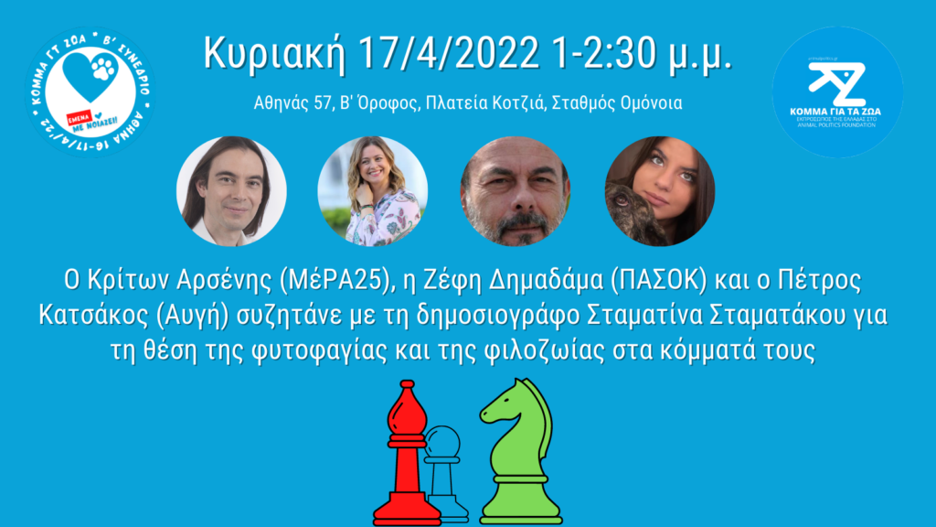 Συζήτηση ενεργών φιλόζωων πολιτών, που ανήκουν σε άλλους πολιτικούς χώρους, για τη θέση που έχει η Πολιτική Φιλοζωία στις παρατάξεις που συμμετέχουν: «Γιατί ψηφίζω το κόμμα μου: απορίες και απαντήσεις των φιλόζωων και των βίγκαν κομματικών στελεχών».