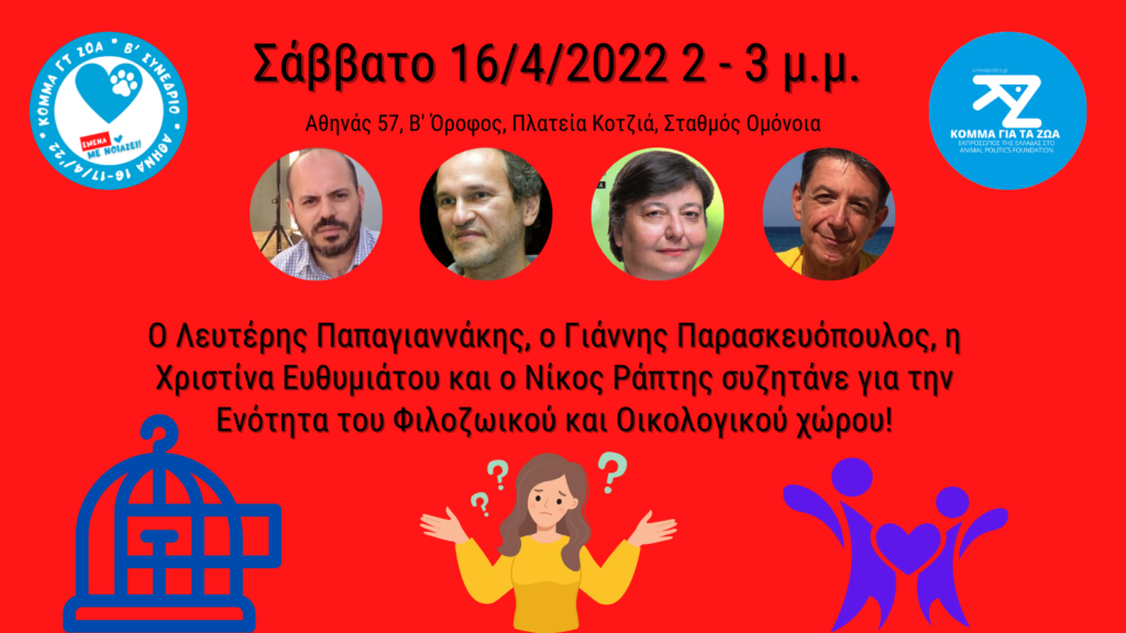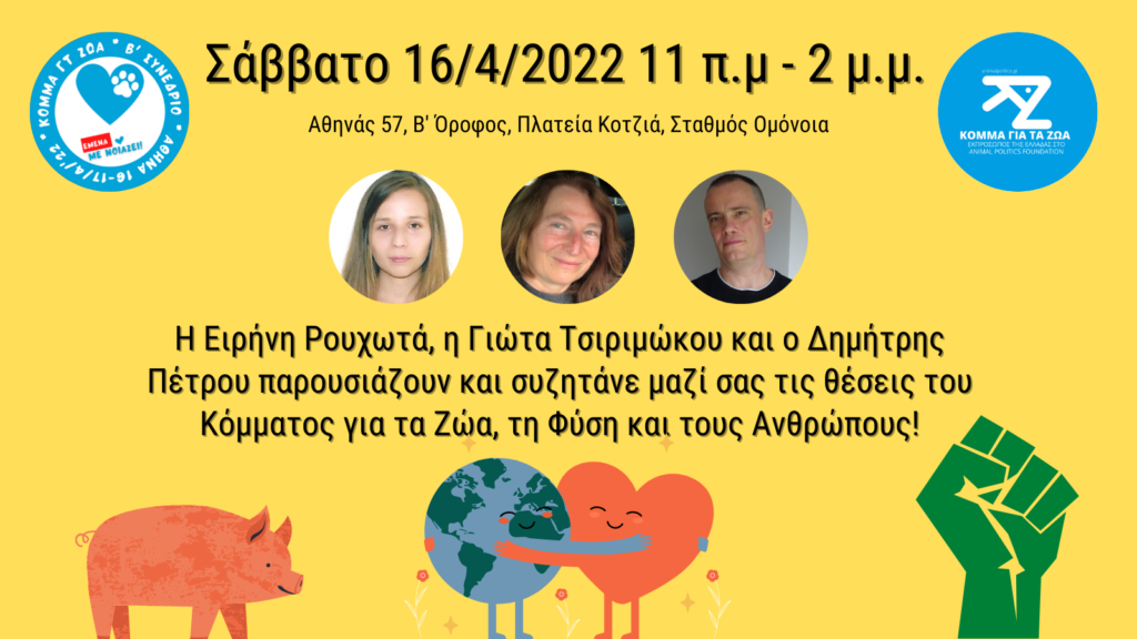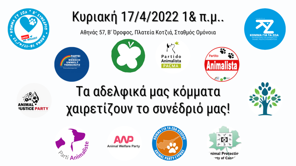 Το Σαββατοκύριακο 16 και 17 Απριλίου 2022 θα γίνει το Β’ Συνέδριο του Κόμματος για τα Ζώα στην Αθήνα, στην Οδό Αθηνάς 57, δίπλα στην Πλατεία Κοραή (Δημαρχείο), 5’ με τα πόδια από τον σταθμό της Ομόνοιας.