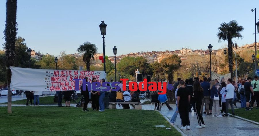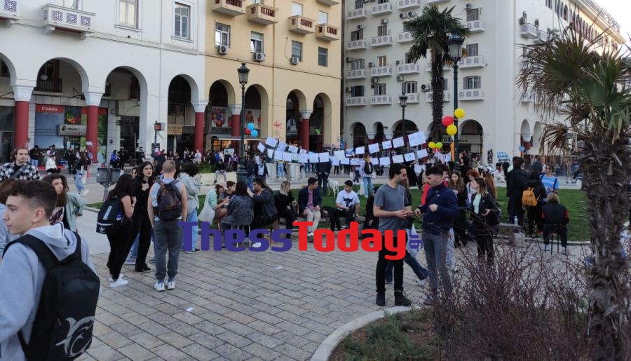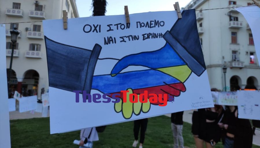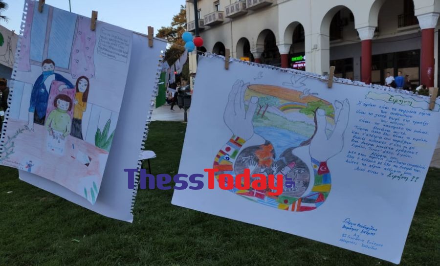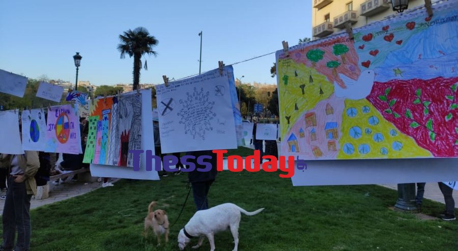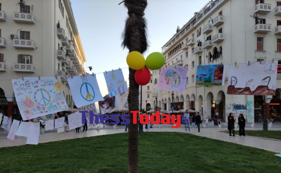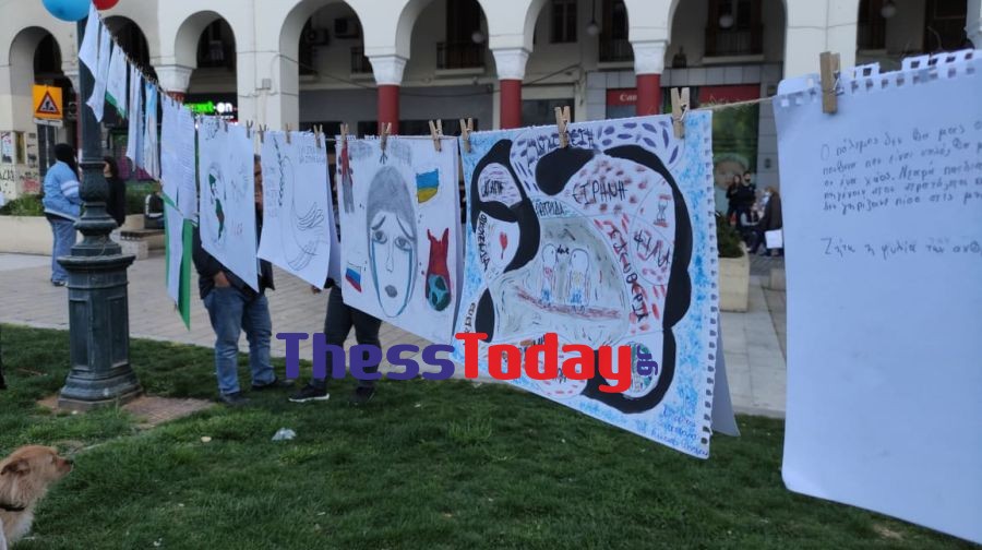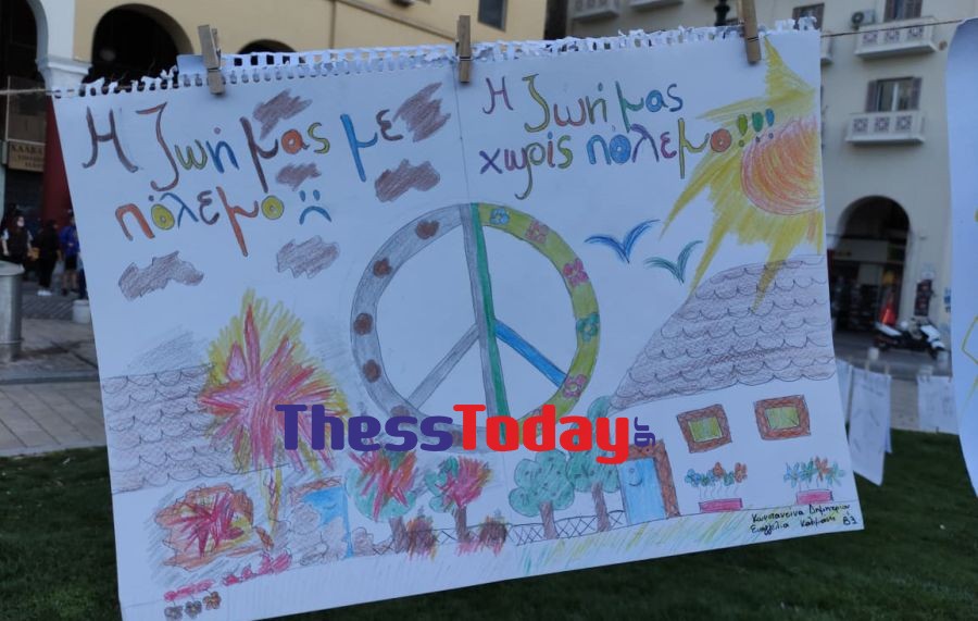 Ζωντανή μουσική, πανό και ένα στέκι ζωγραφικής με ζωγραφιές μαθητών έχουν γεμίσει την πλατεία Αριστοτέλους, απέναντι από το άγαλμα Βενιζέλου. Η λάμψη των βομβαρδισμών αντιπαραβάλλεται σε μια ζωγραφιά με τη λεζάντα «η ζωή μας με πόλεμο», απέναντι στον λαμπερό ήλιο που βρίσκεται κάτω από τη λεζάντα “η ζωή μας χωρίς πόλεμο”, ενώ σε όλες τις εικόνες τονίζεται το μήνυμα της συναδέλφωσης των λαών.