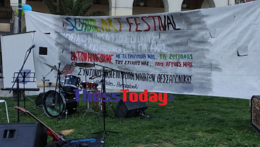 Ζωγραφιές μαθητών με αντιπολεμικά μηνύματα «πλημμύρισαν» την πλατεία Αριστοτέλους το απόγευμα του Σαββάτου, στο πλαίσιο του School Art Festival που διοργανώνεται από τη συντονιστική επιτροπή μαθητών.