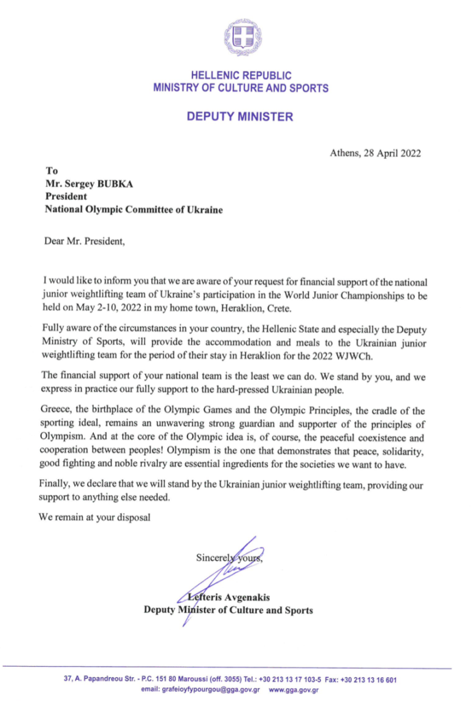 Θα ήθελα να σας ενημερώσω ότι λάβαμε γνώση του αιτήματός σας για οικονομική στήριξη της Ουκρανικής αποστολής η οποία θα συμμετάσχει στο Παγκόσμιο Πρωτάθλημα Άρσης Βαρών Εφήβων – Νεανίδων, που θα διεξαχθεί από 2-10 Μαΐου 2022 στην ιδιαίτερη πατρίδα μου, στο Ηράκλειο Κρήτης.