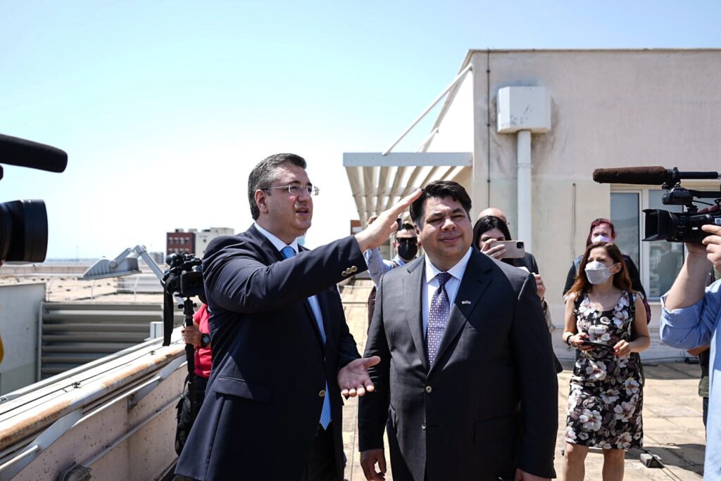 Ο Περιφερειάρχης υποδέχτηκε τον κ. Τσούνη και την κ. Lee, στο γραφείο του και ξενάγησε τον κ. Τσούνη στη Θεσσαλονίκη, από την ταράτσα του κτιρίου, όπου φαίνεται πανοραμικά το ευρύτερο πολεοδομικό συγκρότημα.
