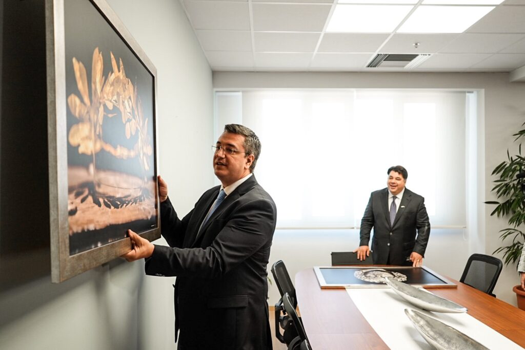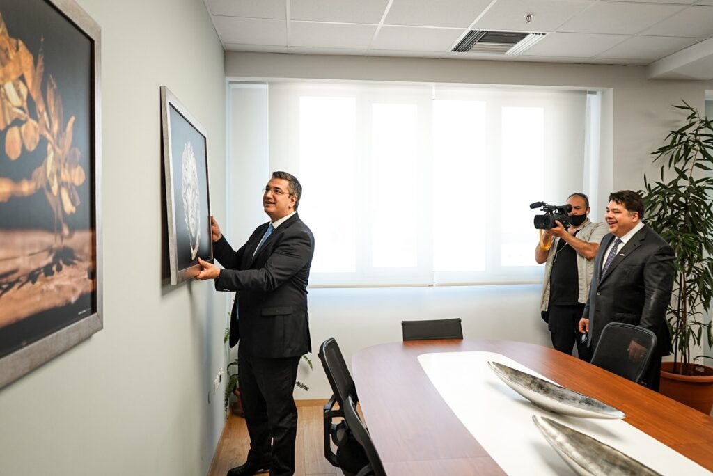 Μάλιστα, ο νέος Πρέσβης των ΗΠΑ δήλωσε εντυπωσιασμένος από τρεις πίνακες, που απεικονίζουν την προτομή του Μ. Αλέξανδρου, το στεφάνι και τη λάρνακα της Βεργίνας, οι οποίοι κοσμούσαν τους τοίχους του γραφείου του Περιφερειάρχη και αμέσως ο κ. Τζιτζικώστας τους ξεκρέμασε και τους δώρισε στον κ. Τσούνη.